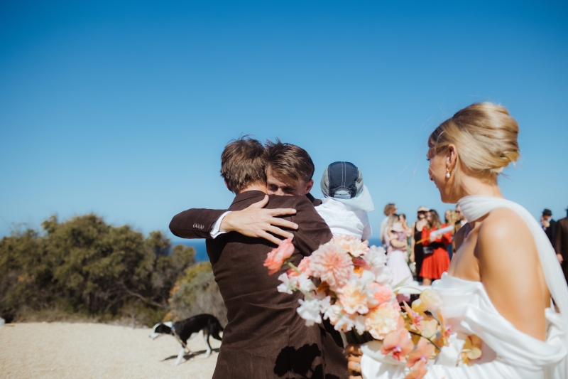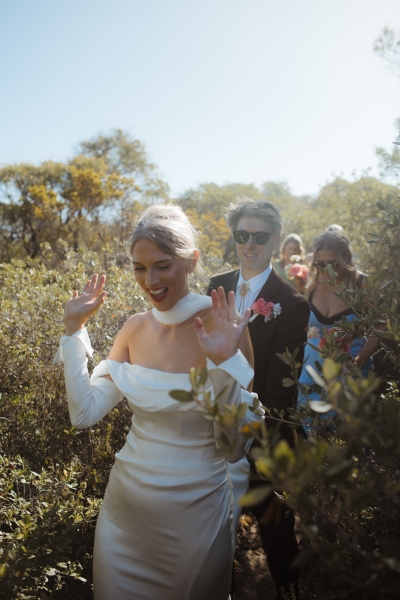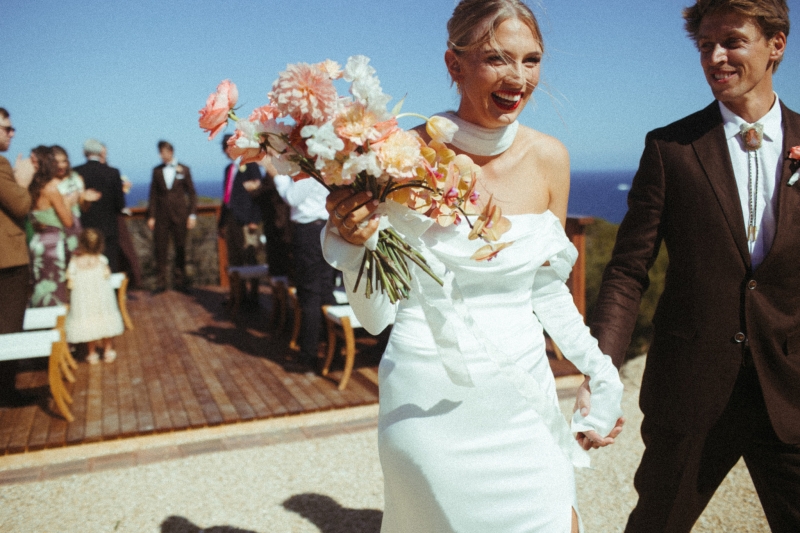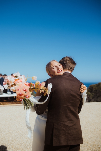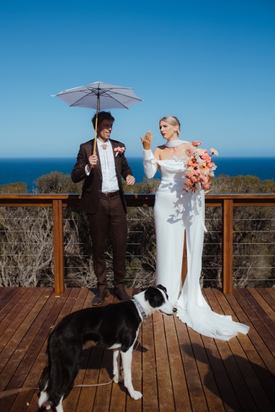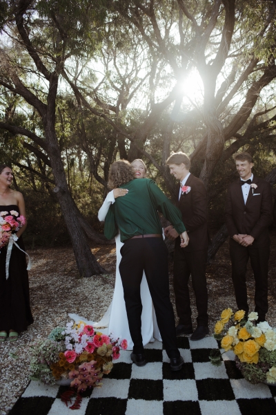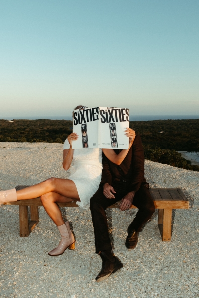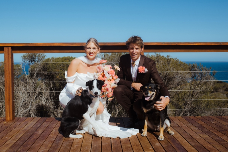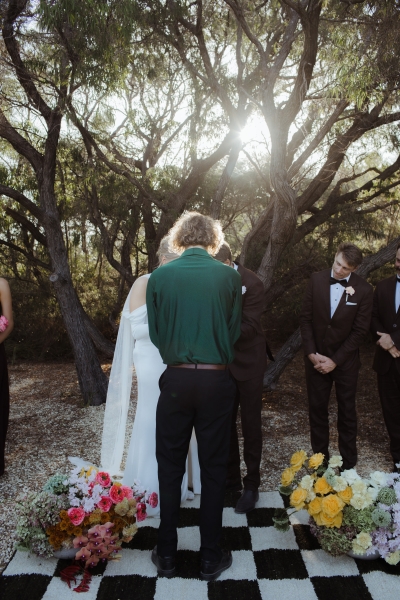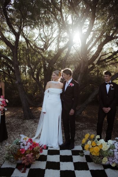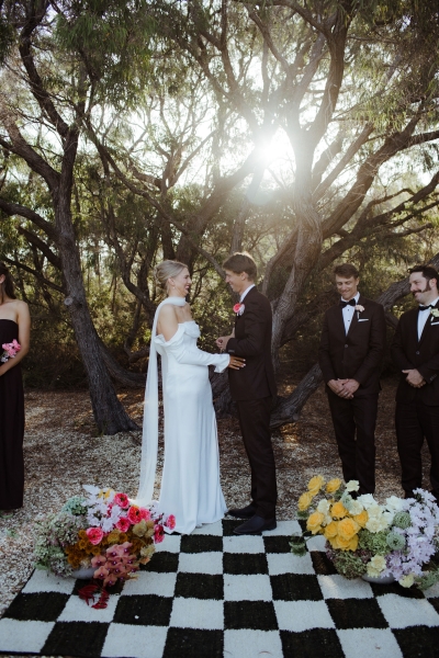 Thanks to Greta’s magic, it was hard for Rohan and Caroline to pick any one photo as their favourite. For Rohan, all the 60s-inspired shots after their outfit change are top of the list. Caroline would definitely agree: “So hard to choose just one! Greta is magic with the camera. I definitely agree with Rohan, the photos with our dogs were so special, and then the bridal party photos when we changed into our 60s gear were SO SO fun – album cover vibes. One of the props we used was a big 1960s fashion book of my mum’s! There are two that really stay with me, one from each ceremony. First one is when Rohan and I have just walked back down the aisle and both smiling SO BIG, and you can see the deck/guests in the background, and I’m holding up my bouquet. And the second one is Rohan and I standing in the ‘Peppermint Chapel’ (the ceremony spot at Salt Cove) and the floral arrangements Prue made are either side of us and we’re standing on the amazing green/white checked wool rug that Brodie helped us source which is now in its forever home in our bedroom and the sun is coming through the peppermint tree behind us! Perfection.”