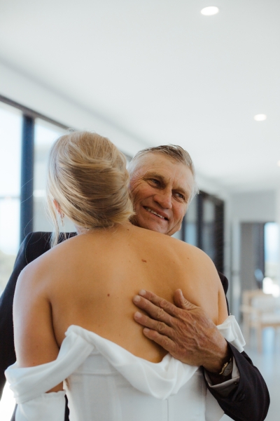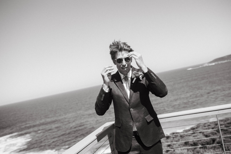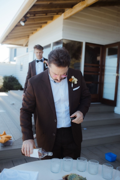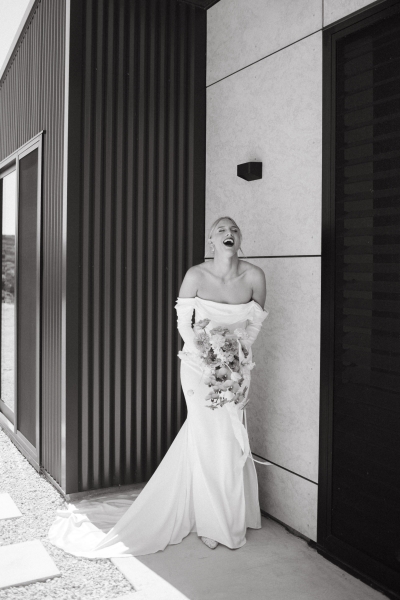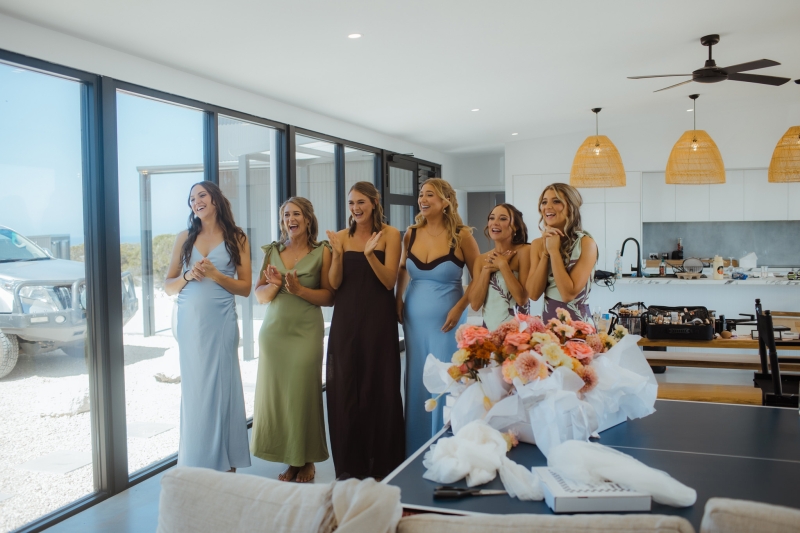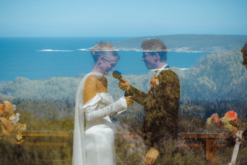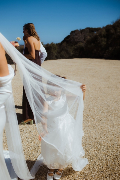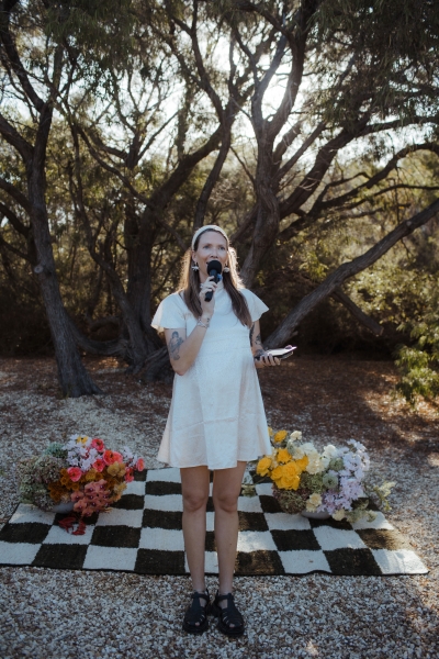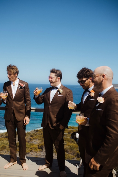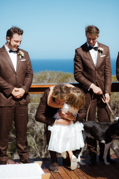 Thanks to Greta’s magic, it was hard for Rohan and Caroline to pick any one photo as their favourite. For Rohan, all the 60s-inspired shots after their outfit change are top of the list. Caroline would definitely agree: “So hard to choose just one! Greta is magic with the camera. I definitely agree with Rohan, the photos with our dogs were so special, and then the bridal party photos when we changed into our 60s gear were SO SO fun – album cover vibes. One of the props we used was a big 1960s fashion book of my mum’s! There are two that really stay with me, one from each ceremony. First one is when Rohan and I have just walked back down the aisle and both smiling SO BIG, and you can see the deck/guests in the background, and I’m holding up my bouquet. And the second one is Rohan and I standing in the ‘Peppermint Chapel’ (the ceremony spot at Salt Cove) and the floral arrangements Prue made are either side of us and we’re standing on the amazing green/white checked wool rug that Brodie helped us source which is now in its forever home in our bedroom and the sun is coming through the peppermint tree behind us! Perfection.”