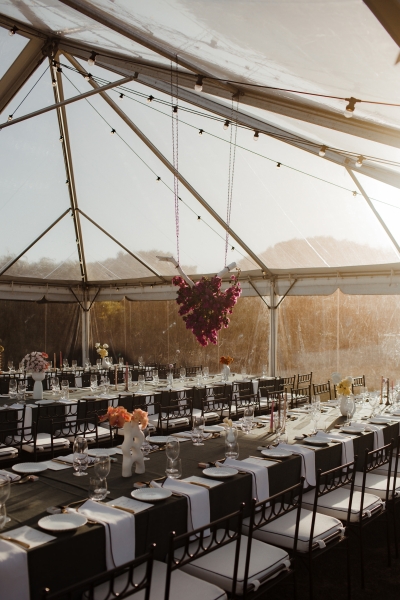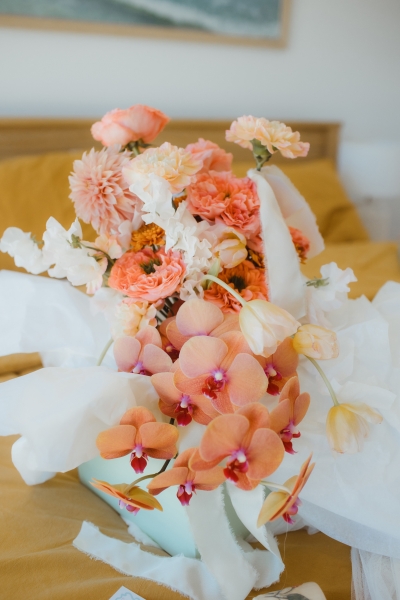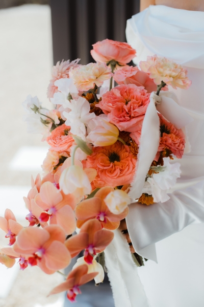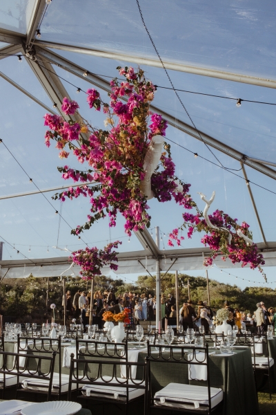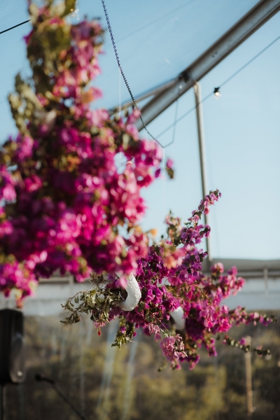 All of the beautiful florals for their retro coastal wedding were created by Prue from Good Batch Co.! “She basically read our minds and created the most incredible, colourful, fun, quirky arrangements ever. Our 10/10 stylist (and venue owner Brodie aka Bib Approach) played a huge part in the flower direction too! One thing we really wanted was Boganville and Prue delivered the most amazing hanging arrangements above the tables in the marquee – it looks SO epic.”