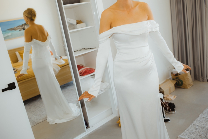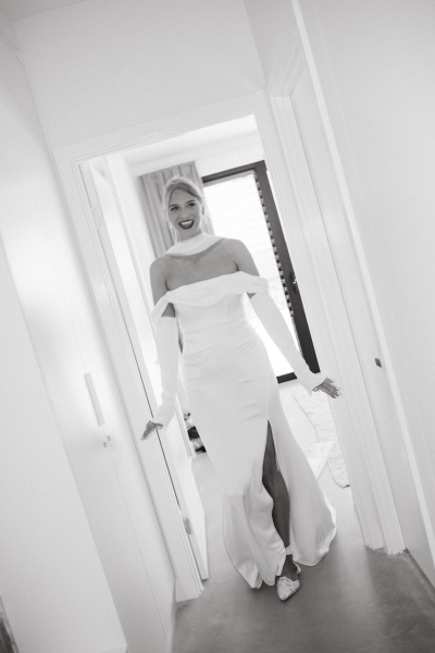Caroline’s first dress of the day was this incredible Ingrid Olić Bridal piece, paired with a scarf veil she made that morning, by cutting some tulle from Spotlight.