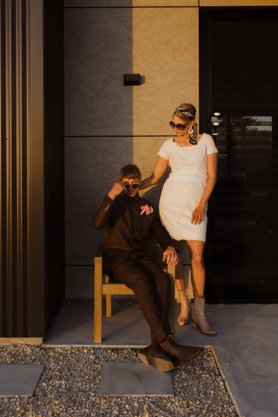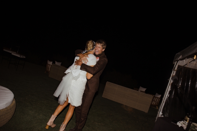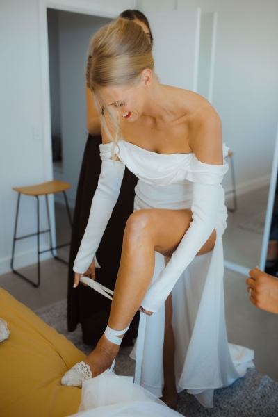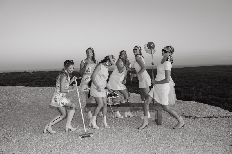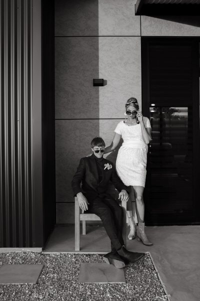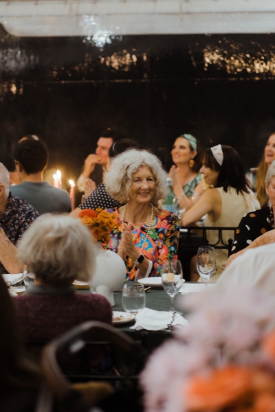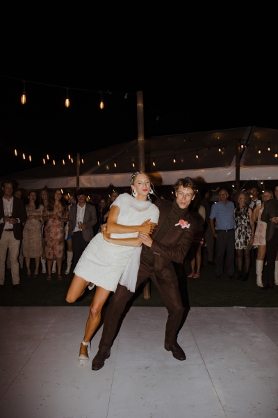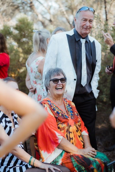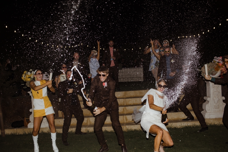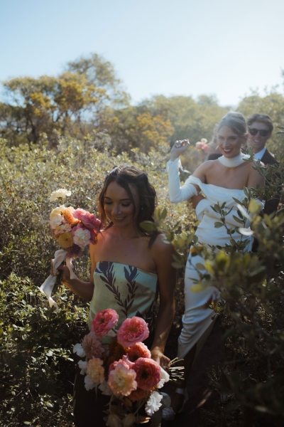 Caroline and the bridesmaids changed into her grandmother’s own dress from the 60s! “My mum (Annabelle) had the dress altered in the 90s for her wedding. And then I shortened it to suit the 60s party vibe we were going for. Being able to wear the dress my mum and Grannie wore was super special. And was the inspiration behind our “60s attire” theme for our guests! Styled with second-hand pink Gogo style boots and a vintage pair of Prada sunnies & a 60s black and white scarf – both of which I found the weekend before the wedding at the same vintage markets where we saw Rohan’s epic bolo tie. Was meant to be!