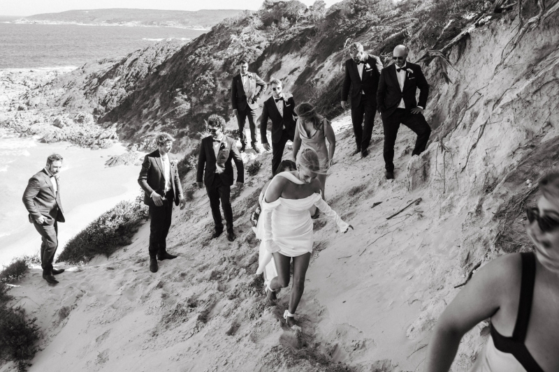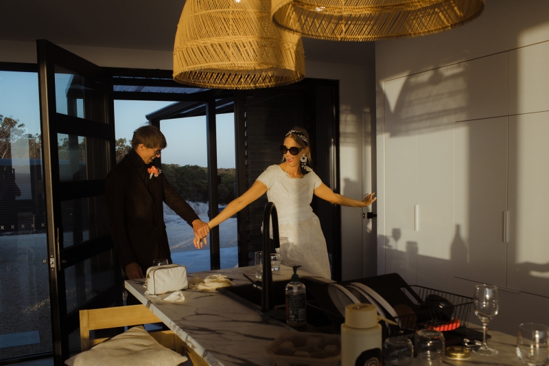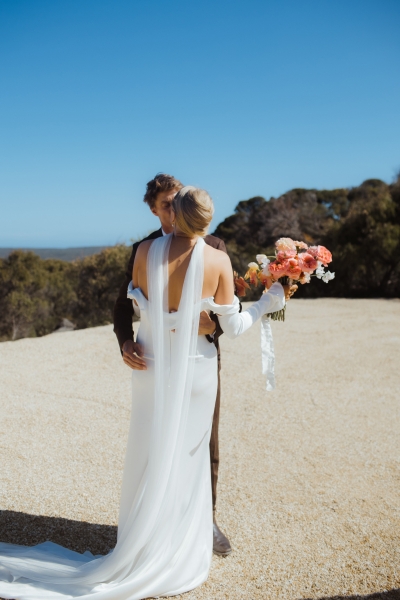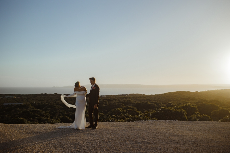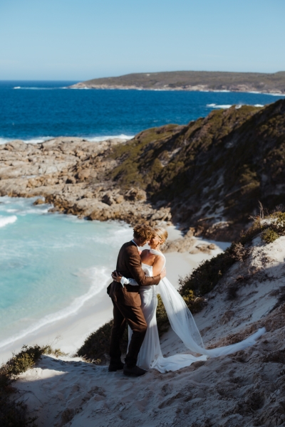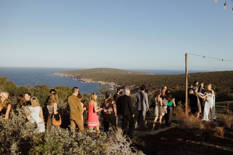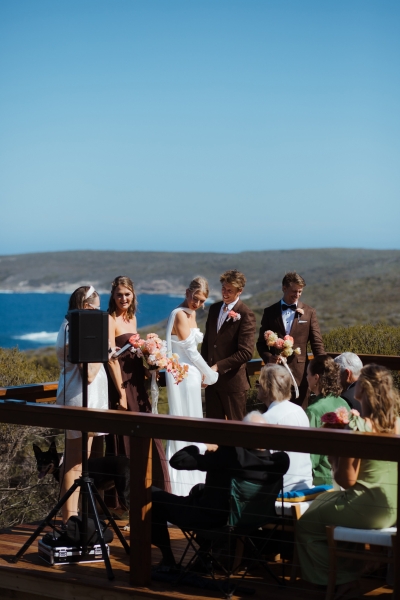 Salt Cover Bremer Bay was the ONLY venue Caroline and Rohan needed to look at – with views like that, why look elsewhere?” Our darling and extremely talented friends Brodie and Isaac Baum recently started this wedding venue in our favourite and local beach town, Bremer Bay. Bremer is a little over an hour from where we live on our farm in Ongerup. It was so important for us to get married where it meant something to us… but we didn’t want to do a full DIY wedding on the farm! So, Bremer was a no-brainer, and Salt Cove was a well and truly dream location. The view from the reception lawn overlooking the cliffs is jaw-dropping. The coastal vegetation that covers the whole block and surrounds the reception lawn and ceremony spot is stunning, and we loved knowing and feeling like we were in the ‘bush’!”