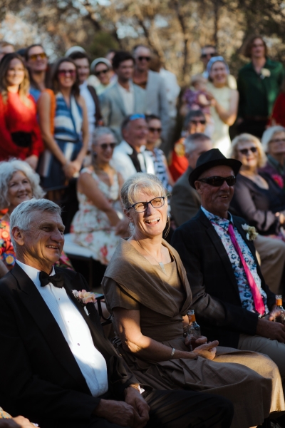 To kick off the second ceremony, Rohan and Caroline walked down the aisle together to the original Elvis version of “Can’t Help Falling in Love”, where 138 of their guests waited. “It was here that our MC Sophie told the story of our relationship, she was with us when we got engaged and for many of our special relationship milestones like our first holidays and lived with Caroline in Kojonup when we were first dating – driving between Ongerup and Kojonup! The vibe for this was fun, colourful, upbeat and charismatic! We exchanged our rings at this ceremony and had Caroline’s brother, David, as our ring bearer. The rings we had made ourselves in a class in Fremantle with Blonde.Perth, which was a beautiful experience in itself.”