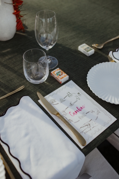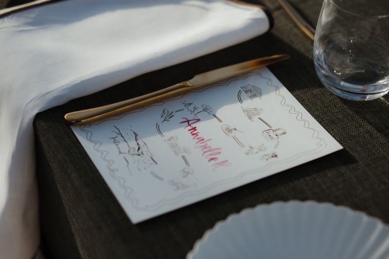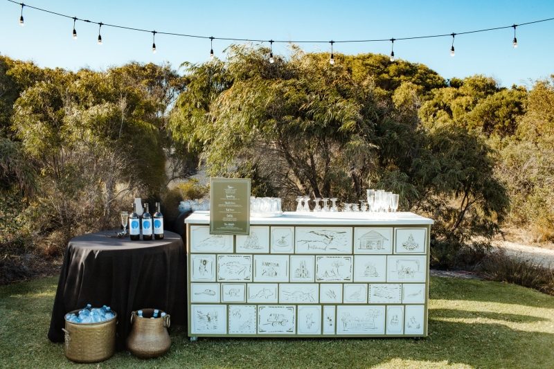 Another creation that really made their reception stand out was the custom-wrapped bar, which showcased all of Rohan and Caroline’s favourite moments from their relationship. “We worked with amazing stationery artist Daniela AKA Creative Line & Co to bring this to life. The idea was for this bar wrap to be saved for us to get framed and displayed in our house! We can’t wait to get it back from the framers and hang it up. Daniela also used some of the sketches from the bar wrap to create a mini visual timeline of some of the most special.”