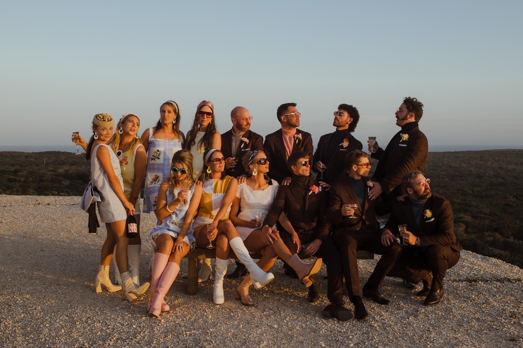 Caroline and the bridesmaids changed into her grandmother’s own dress from the 60s! “My mum (Annabelle) had the dress altered in the 90s for her wedding. And then I shortened it to suit the 60s party vibe we were going for. Being able to wear the dress my mum and Grannie wore was super special. And was the inspiration behind our “60s attire” theme for our guests! Styled with second-hand pink Gogo style boots and a vintage pair of Prada sunnies & a 60s black and white scarf – both of which I found the weekend before the wedding at the same vintage markets where we saw Rohan’s epic bolo tie. Was meant to be!