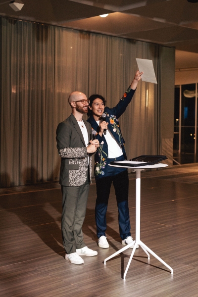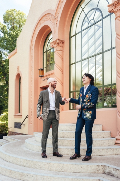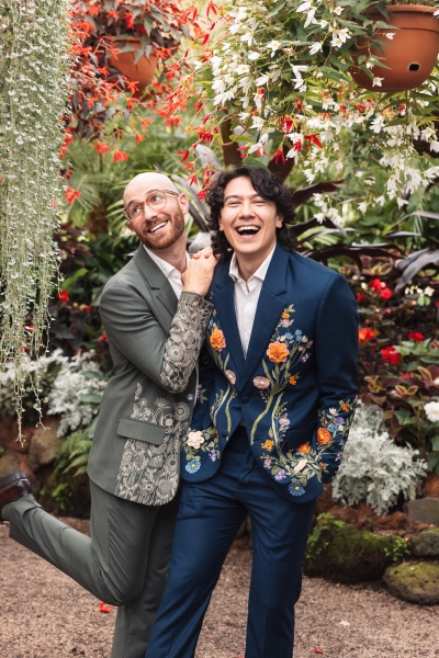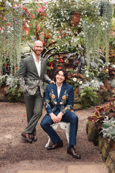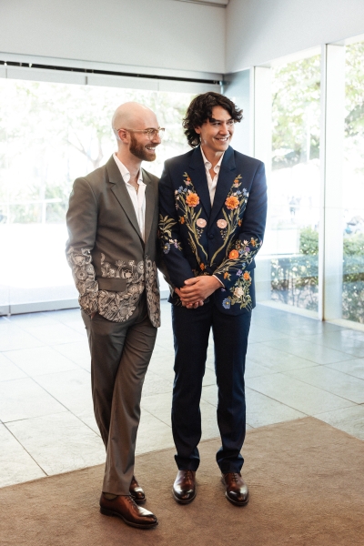 Both Dan and Brandon wore complementary floral embroidered suits from Perte D’Ego, pairing them with relaxed white linen shirts. “The different designs of the suits reflected our different personalities,” Brandon shared.