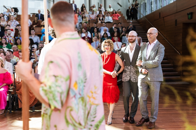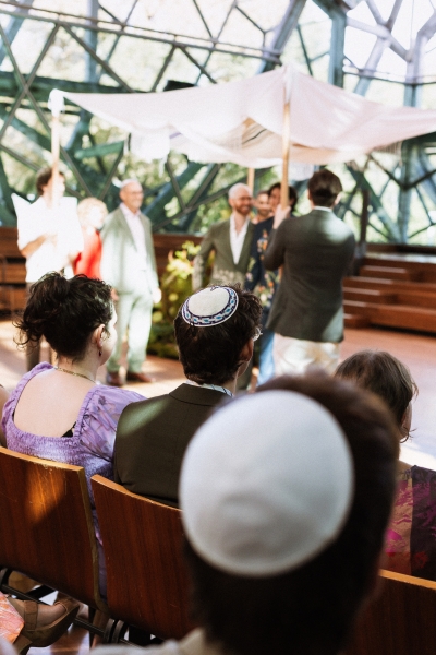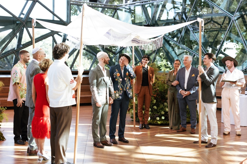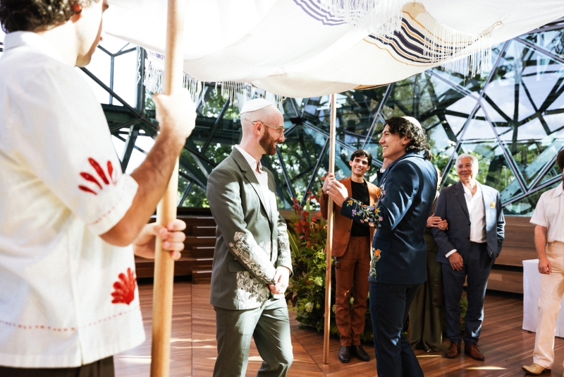 Instead of a traditional wedding party, Dan and Brandon had their parents standing next to them for the ceremony, looking show-stopping! “Dan built the wedding canopy himself, and his grandfather’s taleisim (Jewish prayer shawls) were woven into the chuppah we got married under,” Brandon explained.