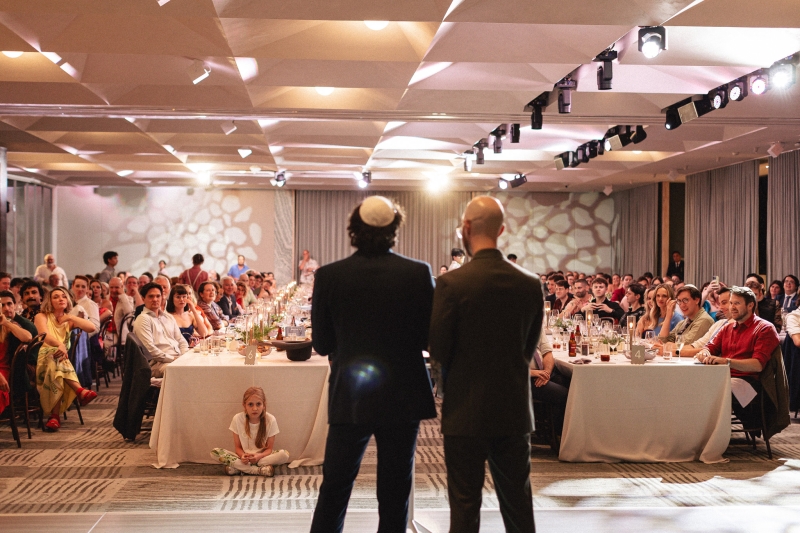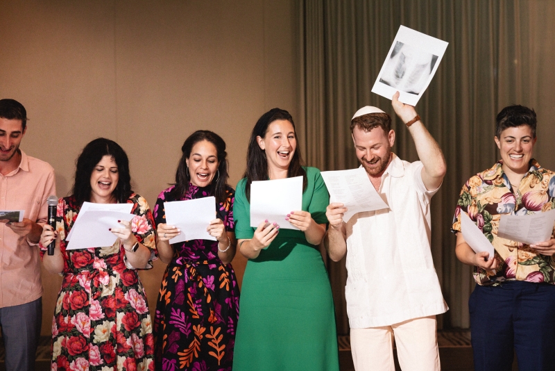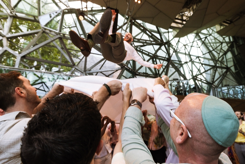 No traditional first dance was had; instead, the couple and their guests broke into a lively hora immediately after the ceremony. “This included our parents being hoisted up on chairs and us being thrown up on sheets.”