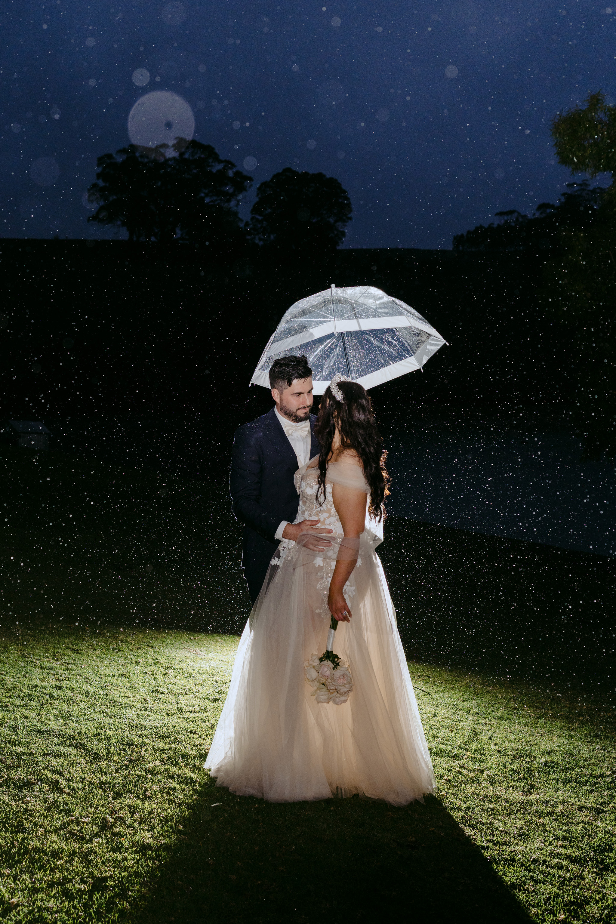Image three description: ⁠At the end of the night, the couple are standing on a swing hanging from a large tree strung with fairy lights. The bride is now in a mini silver sparkly dress as she and the groom stare at one another softly.]⁠