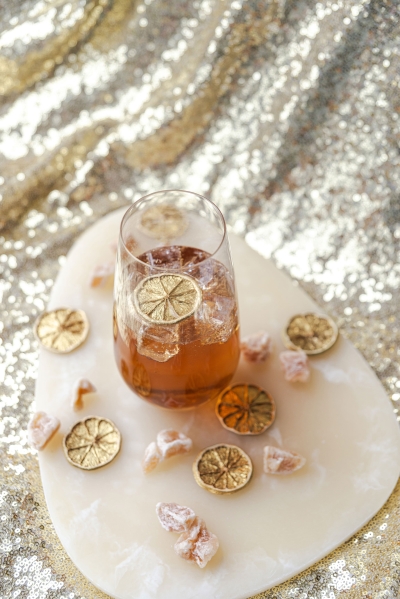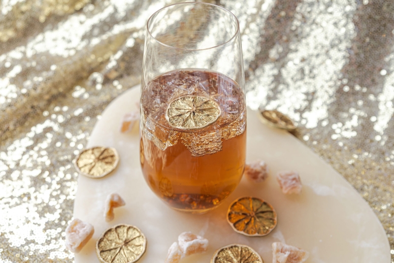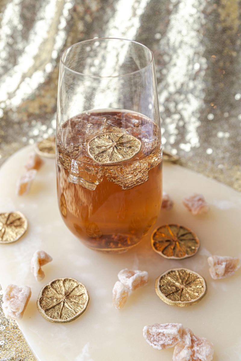 The finishing touch: golden citrus slices from our friends at Mixso Magic, who sent over their 24K golden citrus garnishes for us to play with. Nothing says golden hour like a little bit of unexpected bling after all!