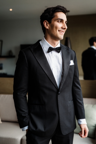 Robert and his wedding party wore classic black suits with a matching bow tie from the Suit Vault.