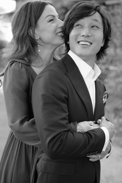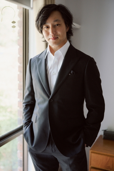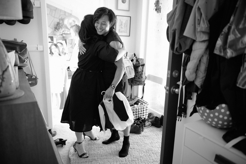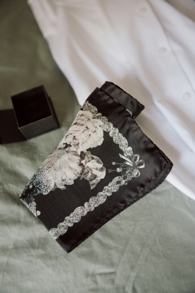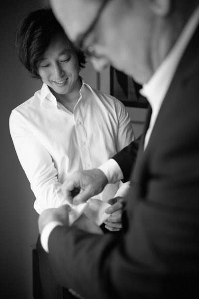His best man was his dear friend, mentor and teacher Sifu Nino Pilla. He also wore a black suit, matching his pocket square to Chan’s – a beautiful printed silk paired with vintage jewellery.