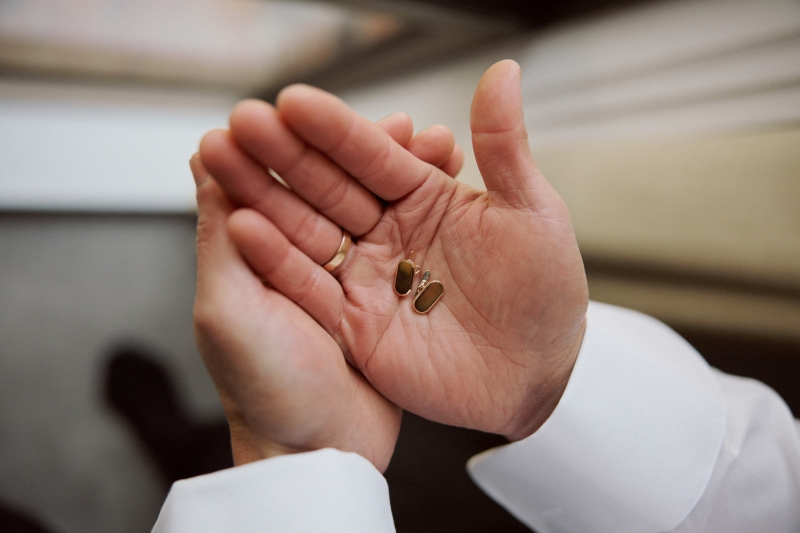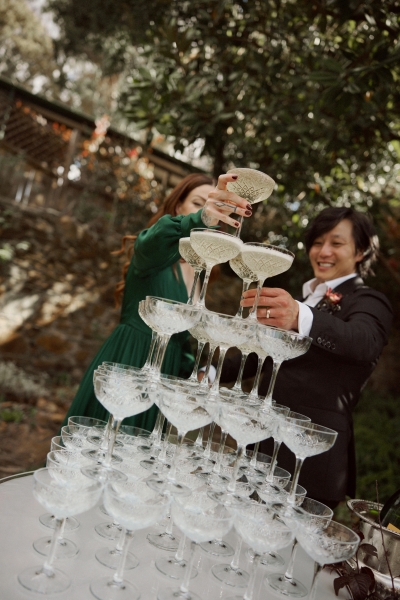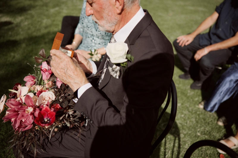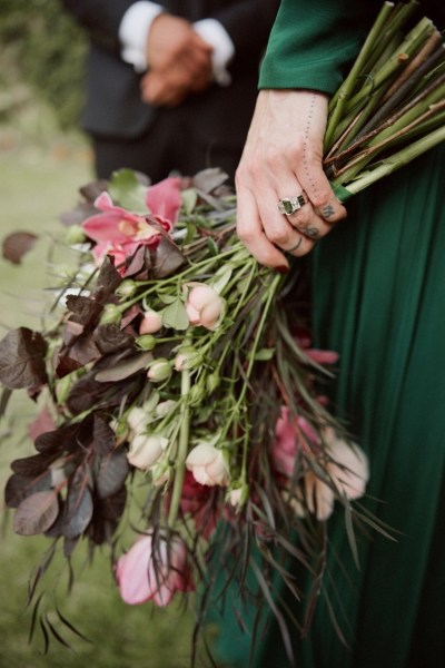 We’re not sure if you noticed, but Kate made a lot of the jewellery for this wedding – and that deserves its own spotlight! From Chan’s wedding ring (made from both of his parents’ wedding rings!!), to his cufflinks with the leftover gold, to her own engagement ring and band. Check out Kate Sutherland Jewellery for more of her beautiful work. “My Art Deco style engagement ring, I made in platinum with a fancy cut 2.76ct green Australian sapphire and Argyle champagne diamonds – The wedding band to match, in platinum with an inner sleeve of gold from Chan’s parents’ rings. My earrings: platinum with a pear-cut tsavorite garnet and white diamonds, and Rosie’s earrings in rose gold with lilac sapphires. To finish, a pair of pearl earrings for my dear Mum. Phew!”