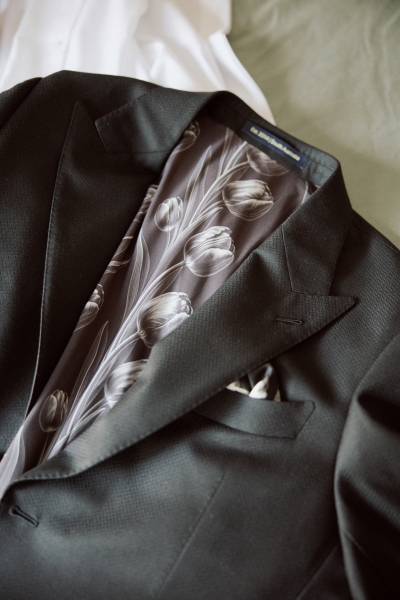 “Choosing the fabric for the inner lining of the jacket was the best part – we selected a beautiful black and white tulip print as a memoir to Chan’s mum, who passed away several years ago – she adored black and white, and every time we see it, it speaks of her.”
