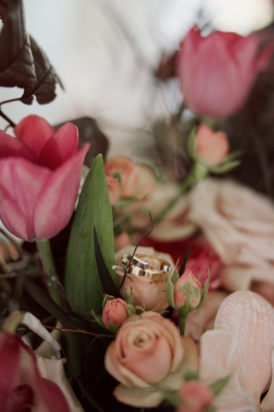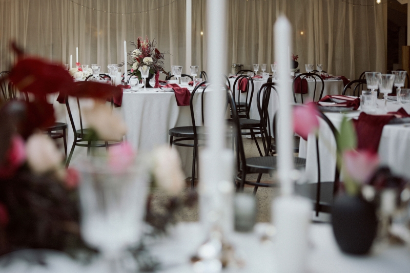 “With the help of our wedding planner, Emily, we found the right balance between all these elements and left the rest up to Alana. On the day I was presented with the most gorgeous bouquets of green and black foliage, deep red roses, pink tulips, white peonies and the most stunning pale pink orchids I have ever seen. These colours were carried through to the ceremony florals and the table centrepieces in the reception space. Each table had its own unique floral arrangement accompanied by slender white candles in glass sleeves.”
