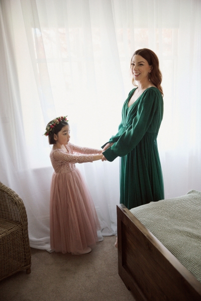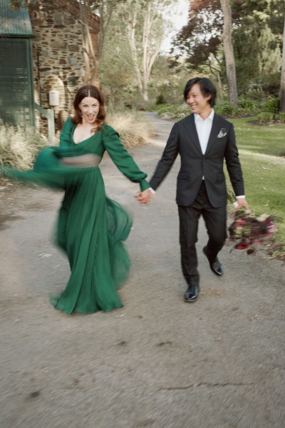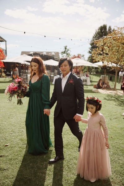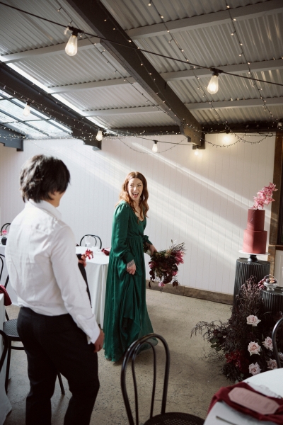 When their wedding album looks this good, there was no way to pick one photo as their favourite. Instead, Kate wanted to share the ones that come to mind when she thinks back on this magical day: “A few include: My daughter captured through the window having her little makeup done. Mum and Dad see me in my dress for the first time. Rosie and I being ridiculous while I was finishing getting ready. Chan’s cheeky smile while we were standing ready for the ceremony. My daughter hiding under my dress during the ceremony. A very clever photo of me holding a champagne glass in the air with my green gown behind it. A capture through the barn doors of our first dance. A capture of me, very very excited to see the cake. Chan and I doing matching hair flips while dancing.”