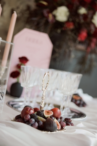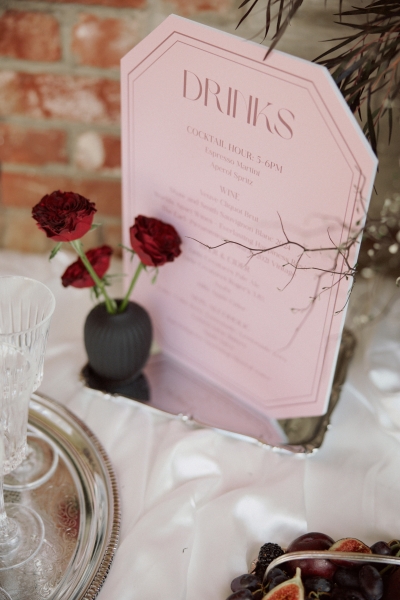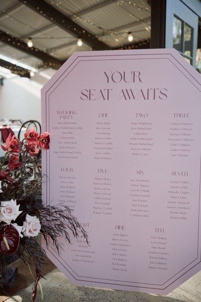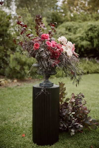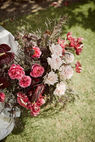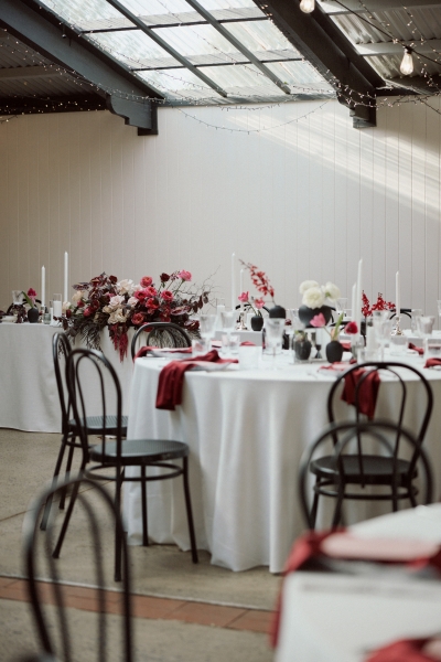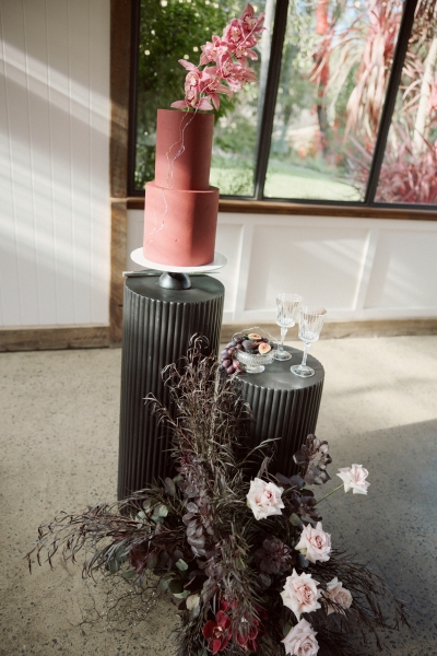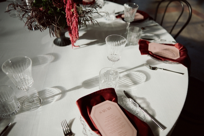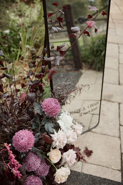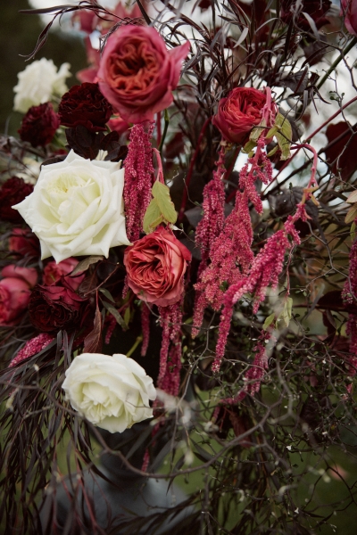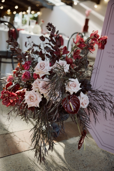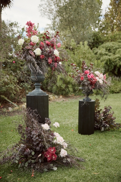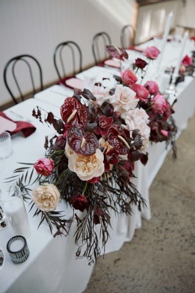 Alana from The Gathered Bunch created all of these romantic florals, perfectly encapsulating the moody tone of the day. “My reference images were all deep, moody and romantic with slight hints of gothic. There were lots of rich bungundies, maroons, dusty pinks and deep greens,” Kate detailed.