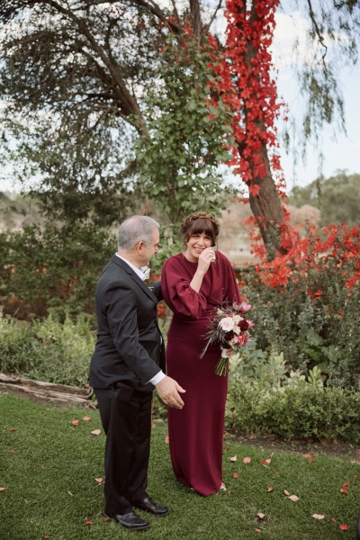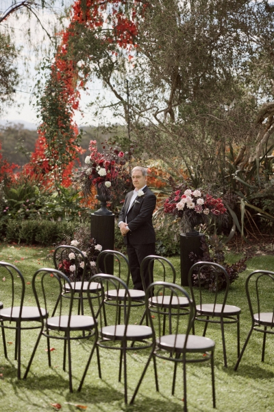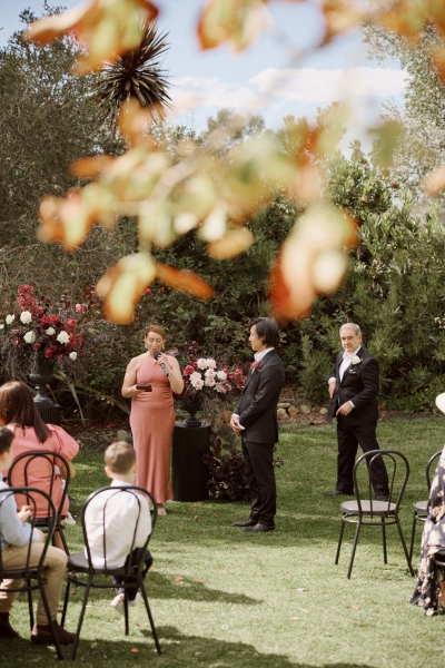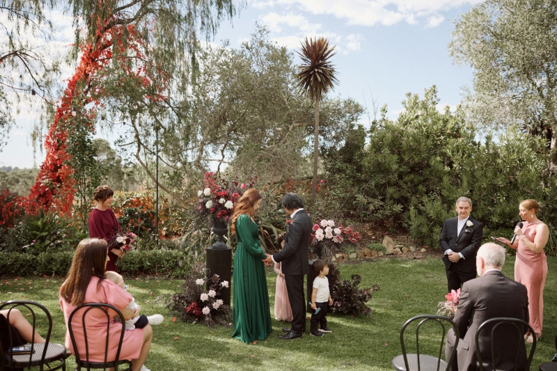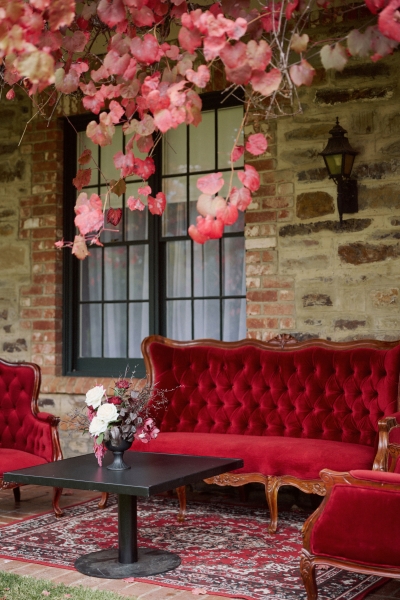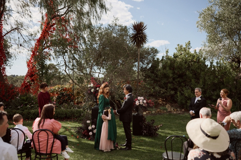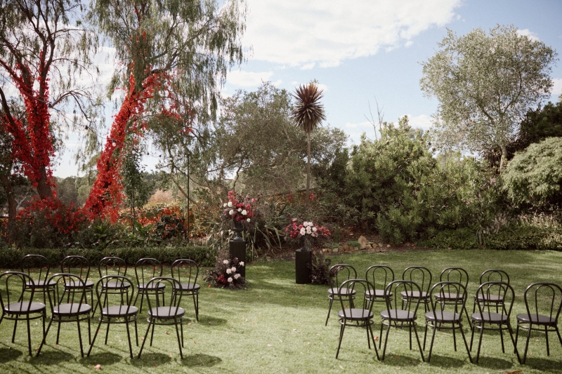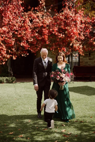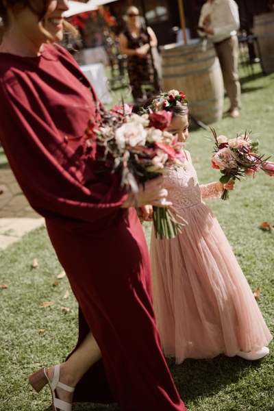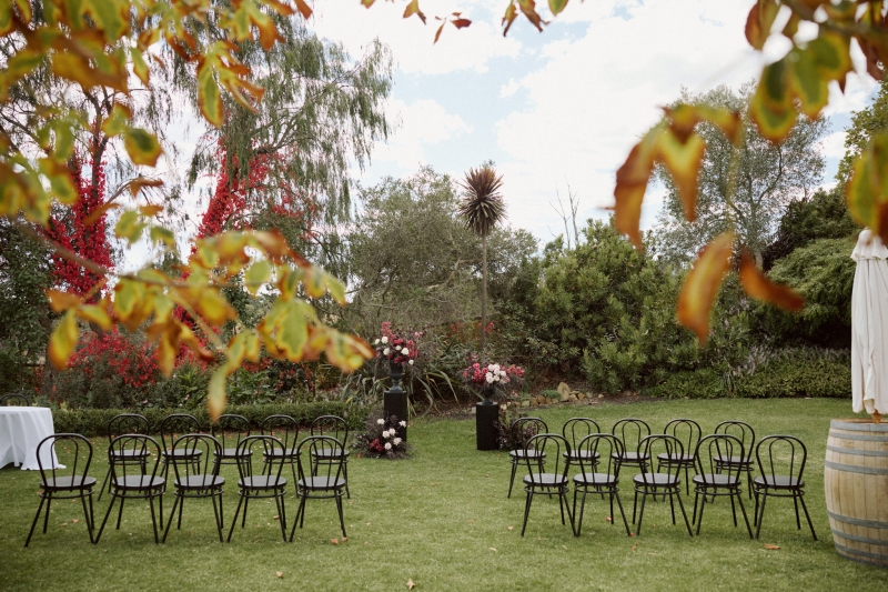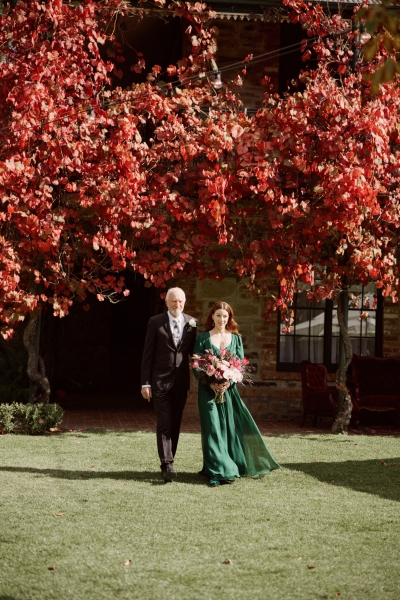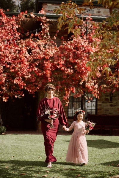 Set against the beautiful Hazelmere Homestead in Echunga, South Australia, this romantic, moody wedding was full of reds, purples and dreamy, dark tones. “It was only the second venue we had visited when we were searching for our place, but as soon as we walked in, we knew it was right. The stunning colours of the Autumn leaves, rolling green lawn, and rustic feel of the homestead were really what caught my eye – it was the perfect size and had the right feel for what we wanted. There was nothing flashy or over the top about it, just charming and serene.”