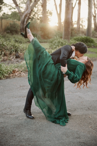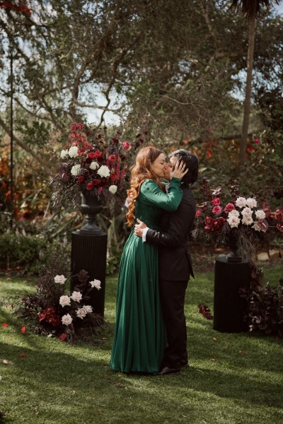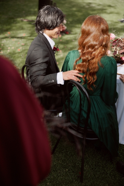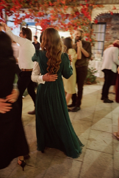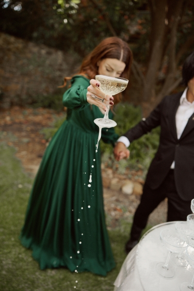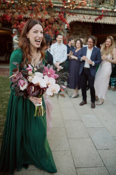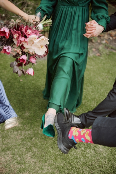 Kate herself wore this absolutely incredible green gown made by the talented Cristina and her team from Couture Love Madness. With fluttery sleeves, a gorgeous v-neck and floaty skirt – never has a gown fit a bride more fittingly! “Straight away, it aligned with what I had been dreaming of and would suit my shape and complexion wonderfully. The experience at Couture Love Madness was truly such a delight. Talking with Cristina and the other wonderful women there was really just like having a chin wag with friends. It was all a very easy and smooth process, and I felt taken care of from start to finish. My favourite colour is green, and from a young age, I knew that if I were ever to be married, it wouldn’t be in white. I truly don’t think anyone was surprised when I appeared in my beautiful green gown!”