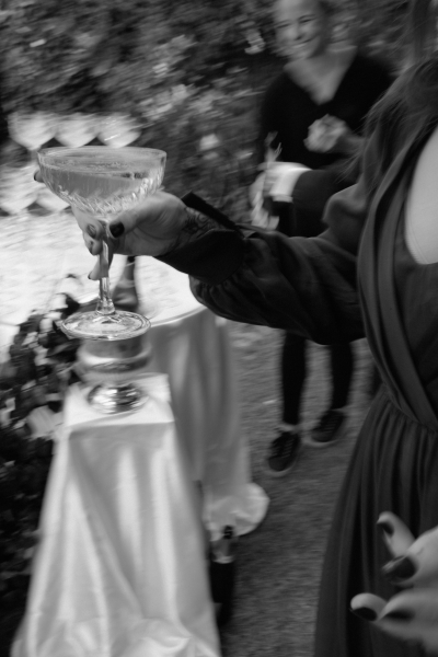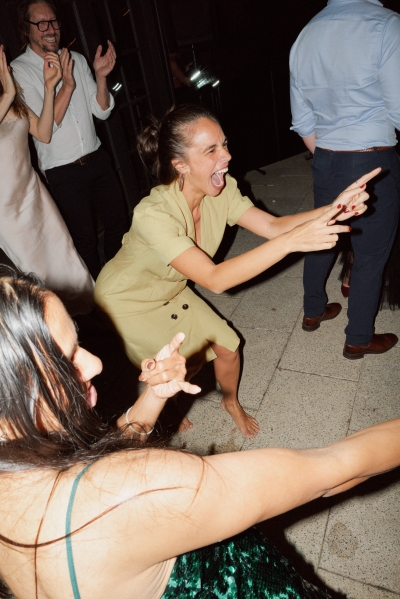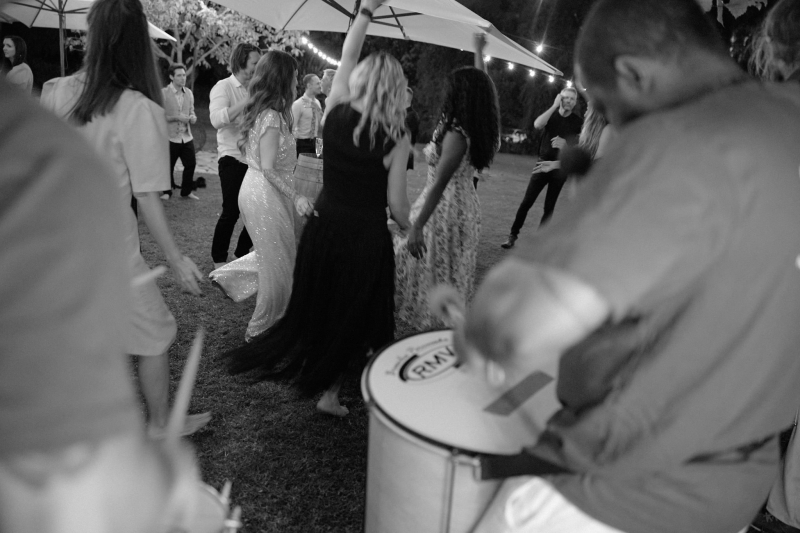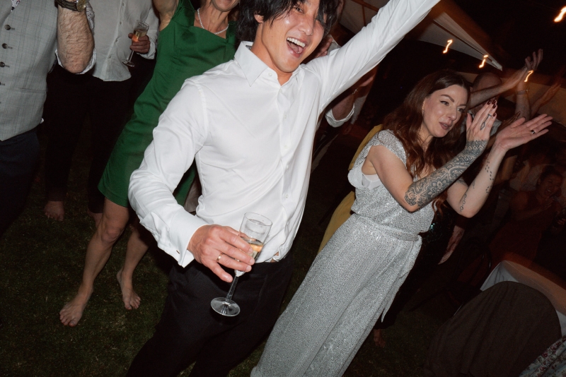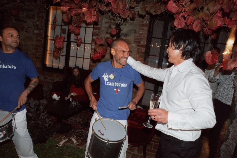 “Right at the end of the night, we had a Brazilian bateria band called Sambatuka come in to play, who are old friends of Chan’s. After they had played their first set, a capoeira roda formed (all with the help of our friends!), and it felt like such a magical moment – even guests who hadn’t played capoeira before were standing, clapping along and bringing their joyful energy. Although I had not done any capoeira for many, many years, I threw caution to the wind and had a game with Chan, in my silver sequin jumpsuit under the full moon. It was very special. Unfortunately, our photographer had left by then, so we only have the occasional phone photo as evidence!”