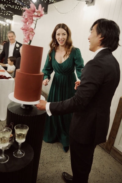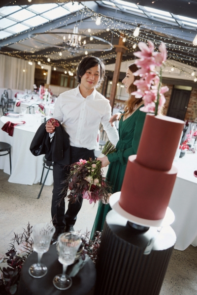 Both the ceremony and reception spaces were styled by the wonderful Emily from The Modern Approach. She even sourced all of the beautiful glassware, tableware, linens, napkins – everything! “The set-up in the reception space was my favourite detail. Everything had been curated so perfectly – the glassware, the ornate silver cutlery, the burgundy velvet napkins, the candles and the flowers. None of this would have come together without our wedding planner (thank you, Emily, you’re an angel!) The cherry on the top of all of this was our cake from Lyons Den Cakes – a two-tiered number with deep burgundy icing and silver and gold kintsugi lines running from top to bottom. Perfection.”