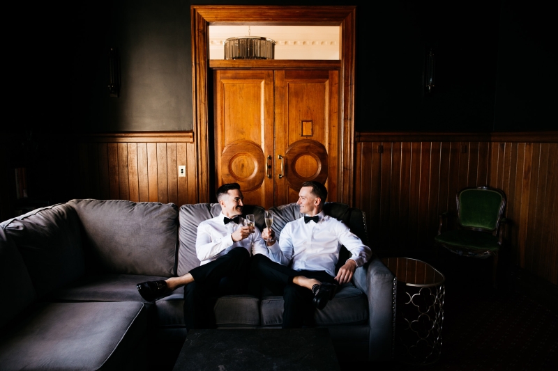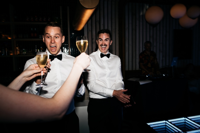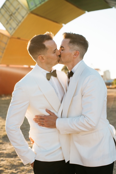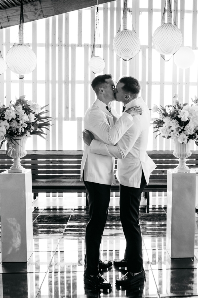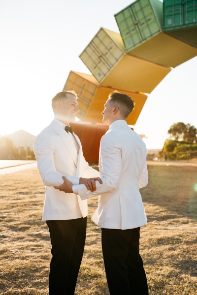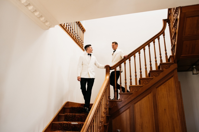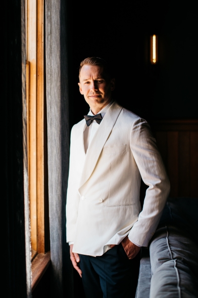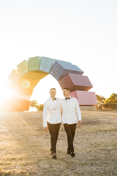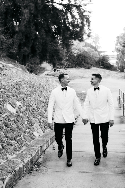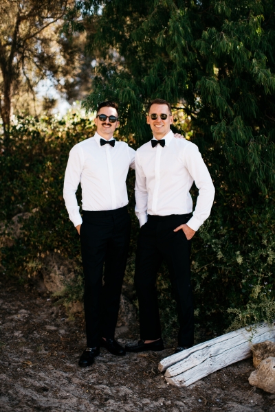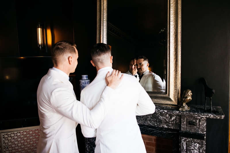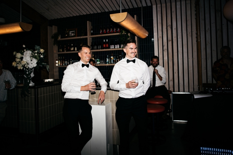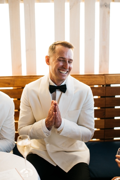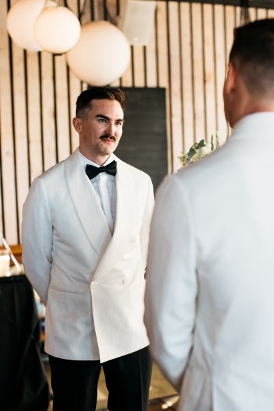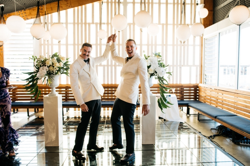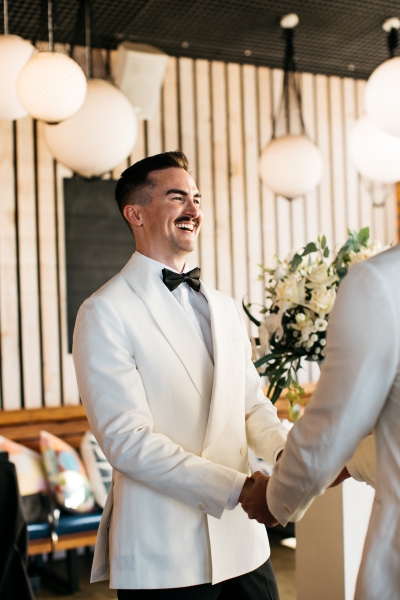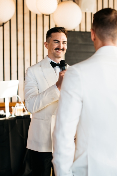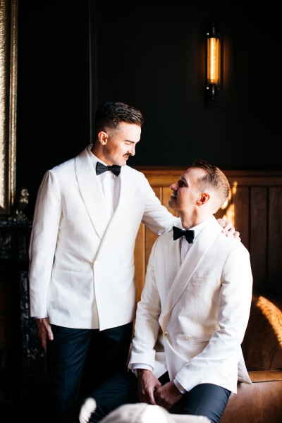 Deciding on a final outfit for the big day was no easy task for either Josh or Simon. The one thing they could agree on? The craftsmanship of an Oscar Hunt custom suit had them head over heels in love! “Classic black and white for the ceremony and then a quick change into something more suited to the dance-floor,” Simon explained.