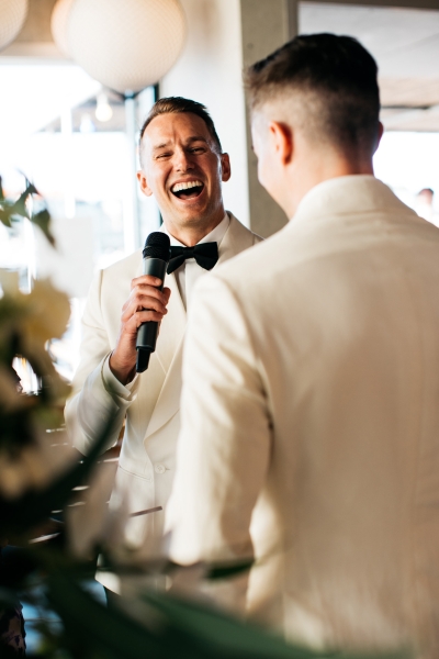 While they opted out of an aisle walk, Josh and Simon still rocked up to their ceremony with a bang: arriving by vintage boat as Donna Summer’s “I Feel Love” blasted from the speakers. “In all the madness of the day, it was so special to spend an hour together as we travelled by boat up the river to the venue. Just us, a bottle of Veuve, and our nerves.” Simon shared.