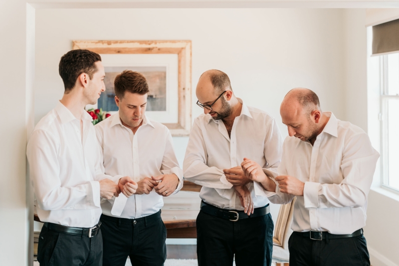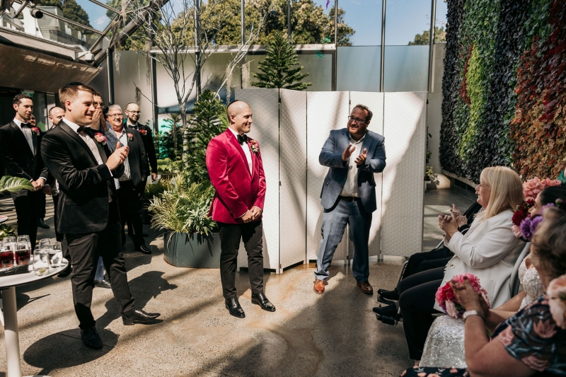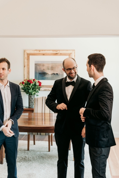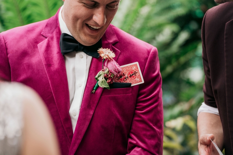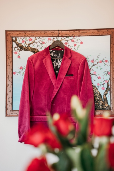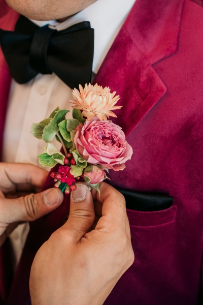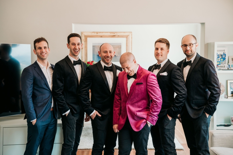 Jamie wore this incredible pink velvet suit jacket from Politix. His groomsmen also wore matching black velvet suits from Politix.