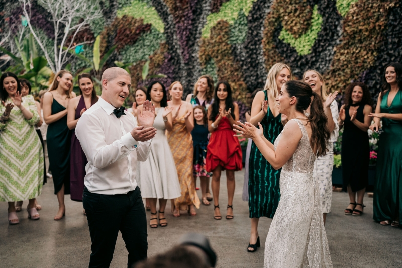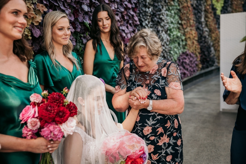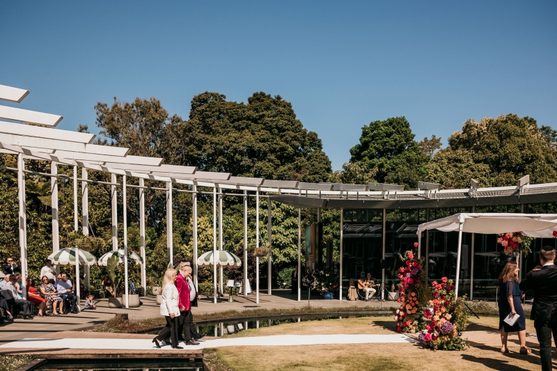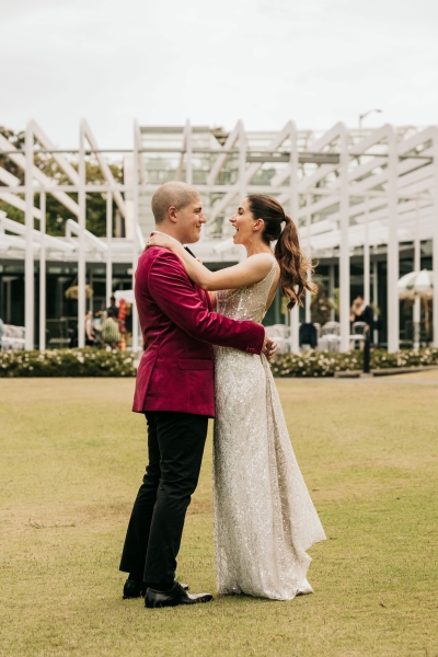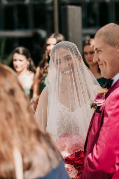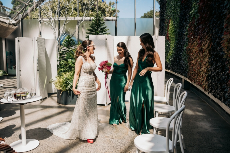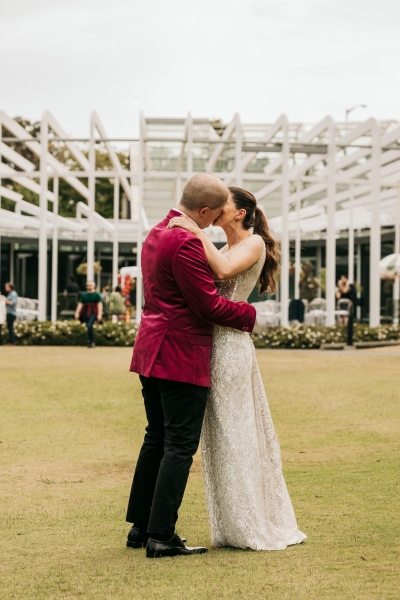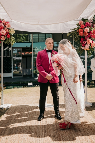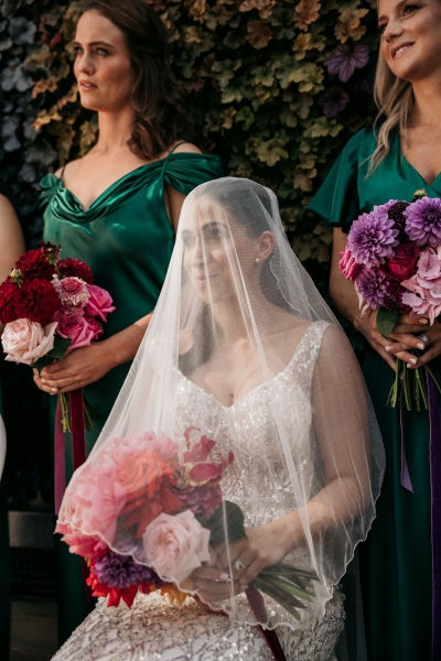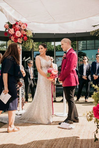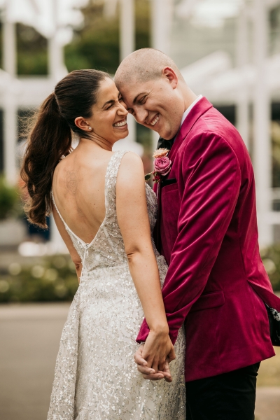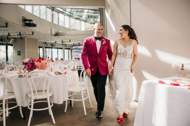 The Calyx in Sydney’s Royal Botanic Gardens was the venue of choice for Carla and Jamie’s colourful wedding. They were completely won over by the three main areas: the outdoor amphitheatre for the ceremony, the unique flower wall for their cocktail hour and the adjoining indoor area for the reception. “It was colourful and unique, and matched our personalities perfectly.”