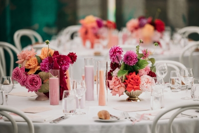 Image two description: ⁠A shot of the whimsical flowers in their reception space, full of pink, yellow and white blooms. ⁠