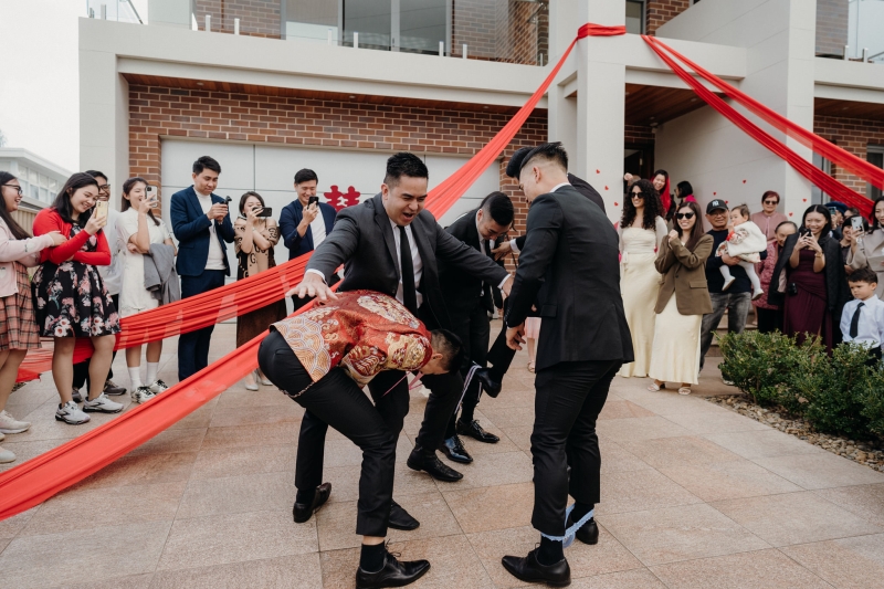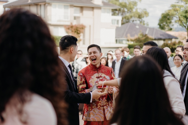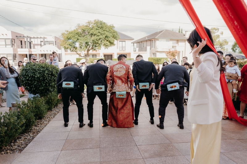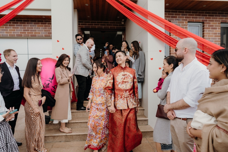 When it came to bringing their Chinese tea ceremony to life, Anita and Steve embraced DIY, and later created their brand (find them here!) to help other couples bring their own tea ceremony to life. “Every single detail was created by us. From designing and setting up the tea ceremony backdrop to styling the front of the house with a bold double-happiness sign on the garage, a giant pink balloon on the front steps, and flowing red drapery, it was hands-on. It was a labour of love, and it gave us the chance to truly personalise every corner of the celebration,” they shared.
