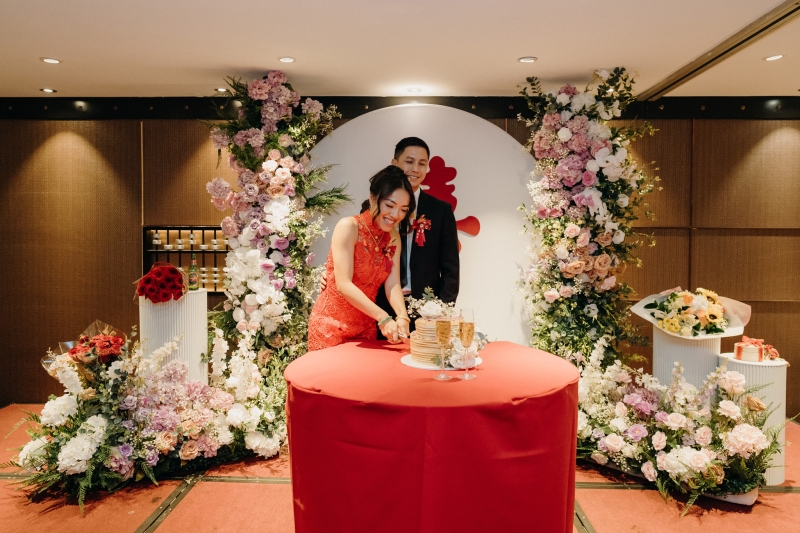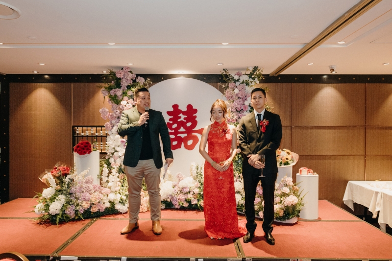 Fresh flowers weren’t used for the tea ceremony or dinner; however, they incorporated fake red flowers in the backdrop to add vibrancy. “Our tea ceremony was a beautiful blend of tradition and elegance, designed to feel both meaningful and visually striking. The maroon double-happiness symbol, styled backdrop, and florals set the scene for a moment that honoured our heritage while remaining timeless and refined. We wanted the atmosphere to be warm, vibrant, and full of joy. From the fun of the door games to the heartfelt act of serving tea, it was a chance to celebrate love, family, and culture in a way that felt truly special,” they explained.