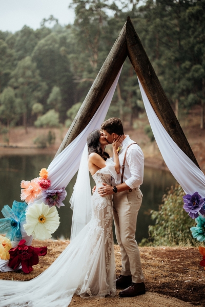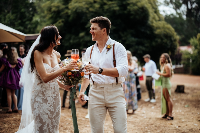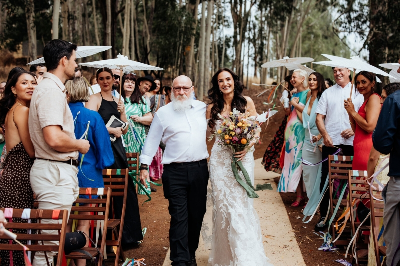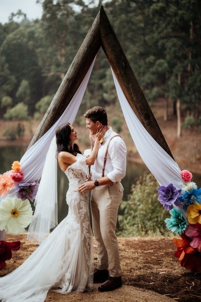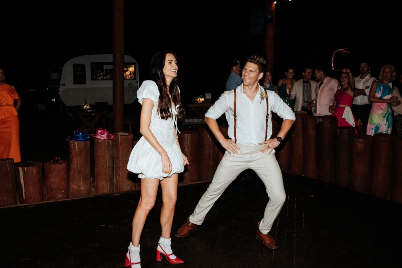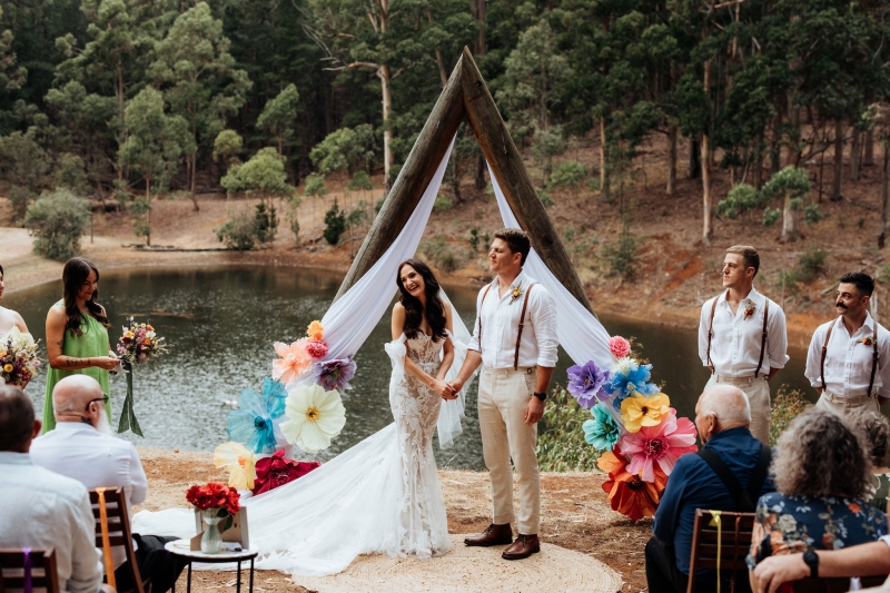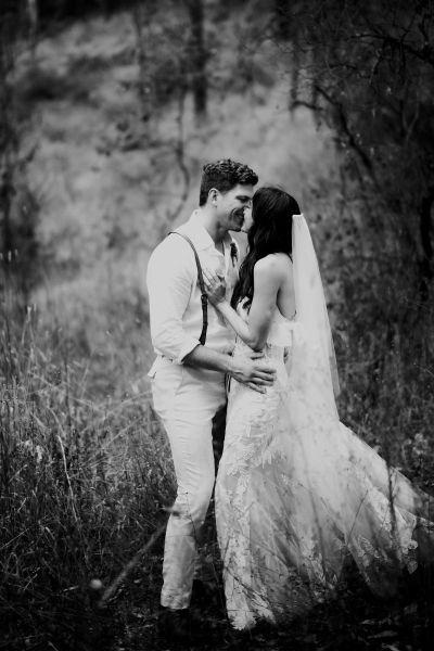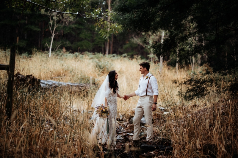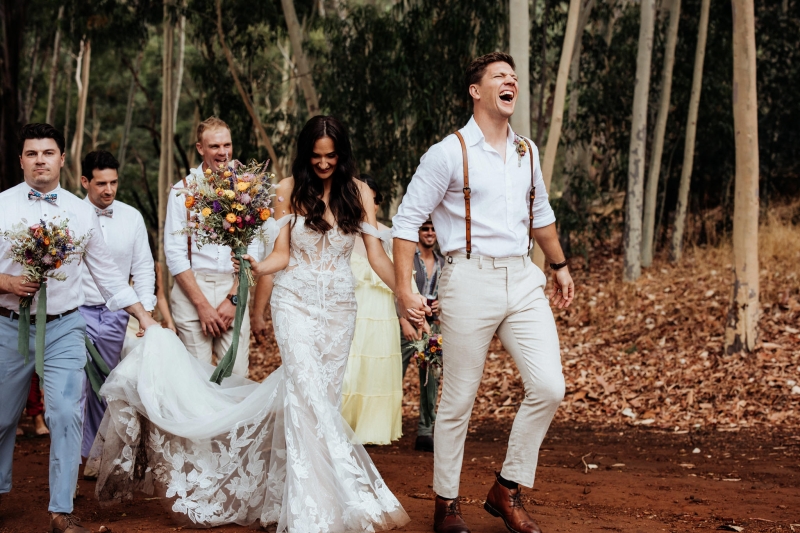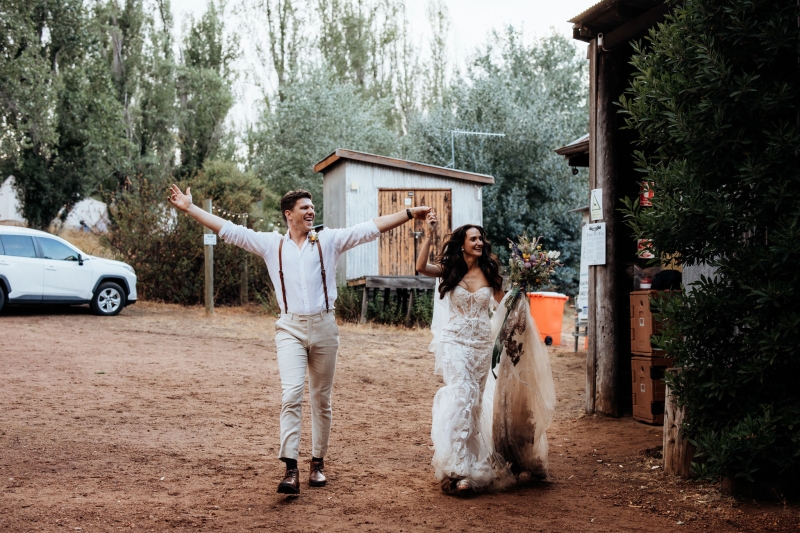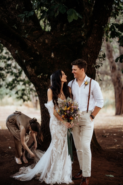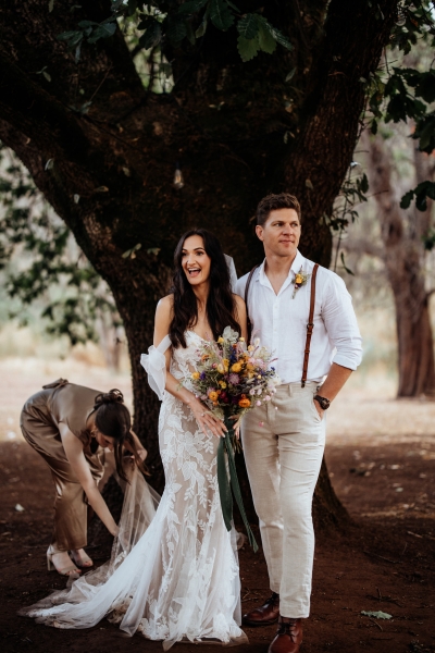When they were searching for the perfect venue for this festival-inspired wedding, the main non-negotiable they wanted was no curfew – meaning maximum boogying hours. “We found a blog which included five curfew-free venues, we ended up visiting three of them, and Lewana Cottages felt like us from the start. We both grew up outside of Perth, so we wanted a venue that felt like the country, where we could be outside among the trees and kick up the dirt. Lewana gave us the freedom to make the weekend what we wanted it to be. Having the three days at the venue meant we had enough time to nestle in with our guests, and Errol and Nola were so accommodating and helpful the whole way through. We were even able to stay at the venue over the June long weekend with our bridal party to show them the venue, and we took our parents there for a weekend too, so we really got to know the venue and owners, which added to the overall experience!”