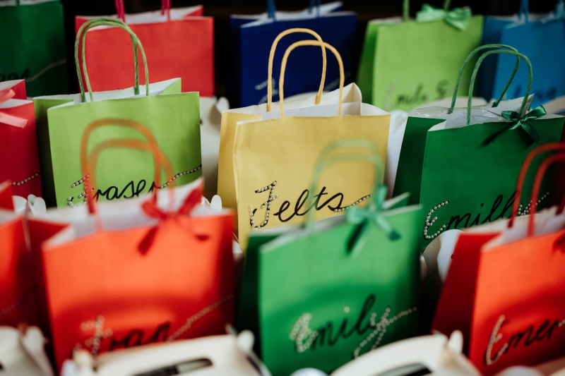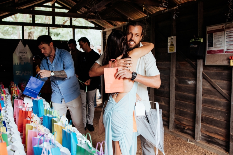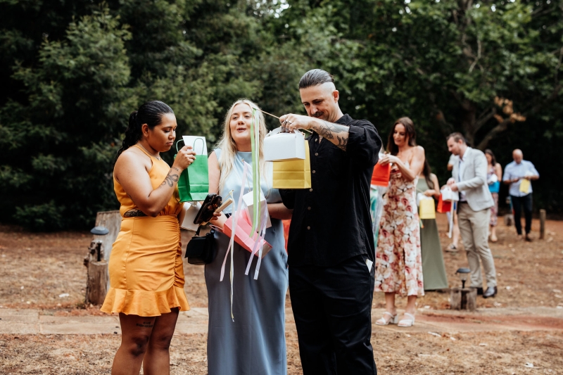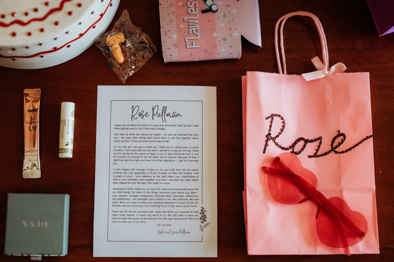 Laura and her mum handcrafted all of the colourful gift bags for their guests, which included not only a custom wedding map Laura had designed for their wedding brochure, but also a personalised letter to each of their guests. “Our guests described the moment when everyone was reading the letters, it went silent, and you’d hear random giggles or sniffles. Josh and I both added something to every letter. For us, it made us really think about each of our guests and the impact they’d had on our lives and the memories we’d shared as we were leading up to the wedding, so Josh and I had such appreciation for everyone by the time we got to the day and saw everyone. Equally, our guests couldn’t believe the time we’d put in and said how special it had made them feel. We think it really impacted the feeling and atmosphere for the rest of the night. Just a lot of all-around love in the room.”