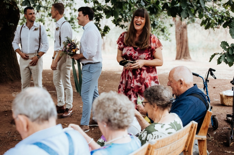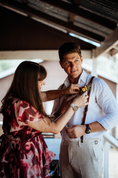 As everyone knows, fresh flowers don’t thrive in the heat of summer, so working with their florist, Bewitched Blooms, Laura chose a beautiful array of colourful dried flowers. “We knew it was likely going to be a warm day, so we wanted flowers that would last, but also incorporated the native wildflowers from the area.”