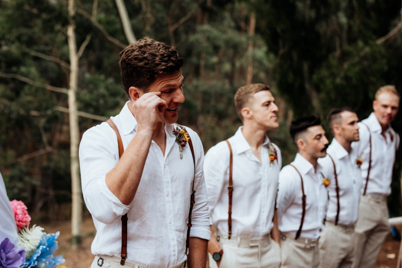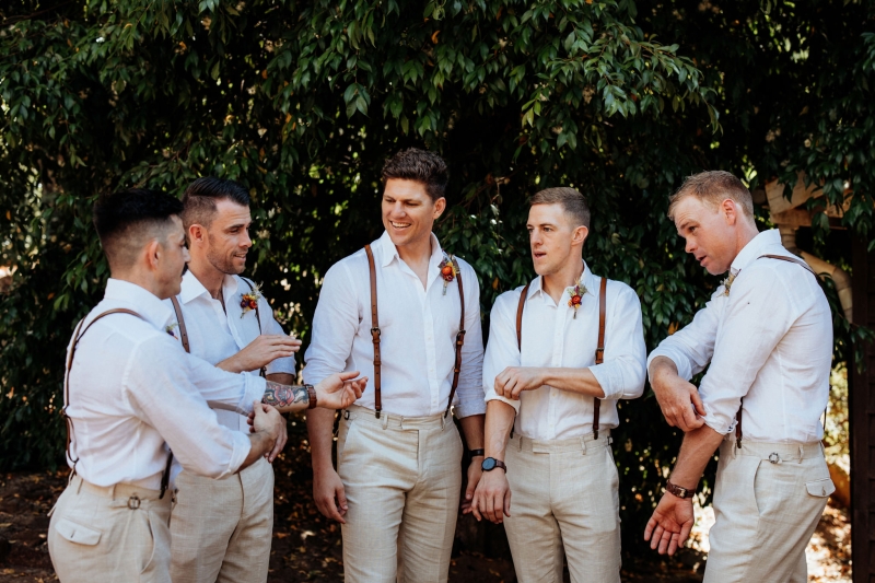 Josh chose cream pants, a crisp white button-up and brown leather suspenders for his wedding attire. Wanting to look the part of the country boy he is and also matching the rustic settings, his wedding party looked perfect for the fun to come. “He didn’t want to be wearing a suit jacket in the heat, and we both wanted to keep the relaxed feel to the day as much as we could.”