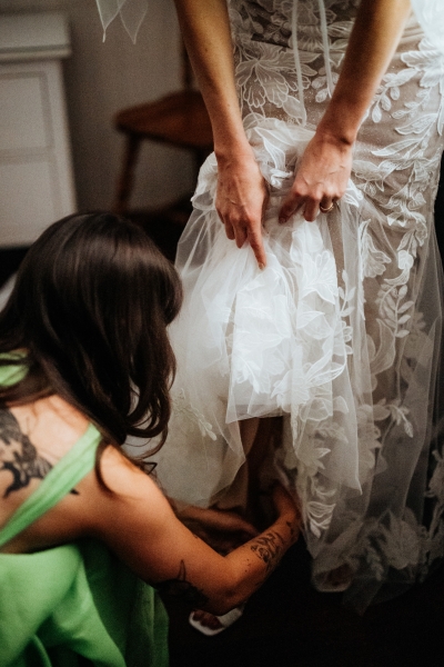 Laura’s mum inspired two pieces of her final look of the night: creating a garter for Laura from her own wedding dress and inspiring her to wear red shoes. “My mum wore red shoes at her wedding so I wore red shoes with my short dress from For Love And Lemons when I got changed.”