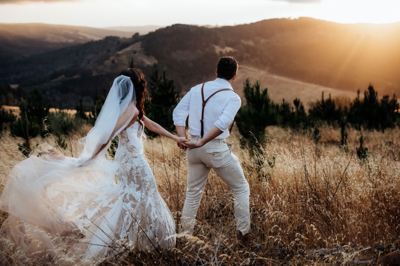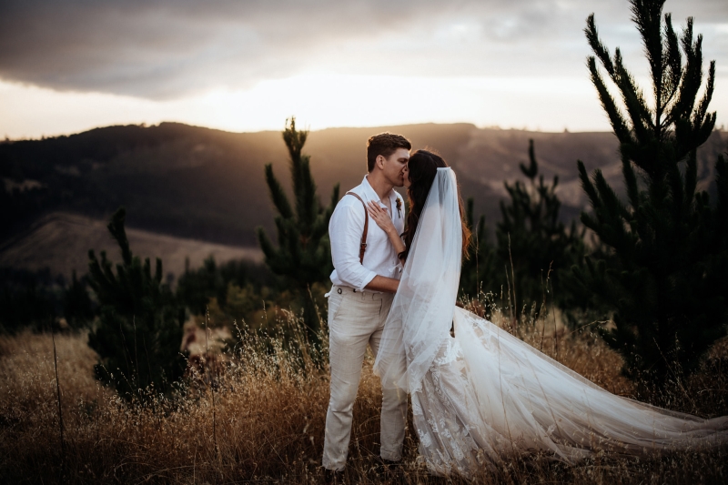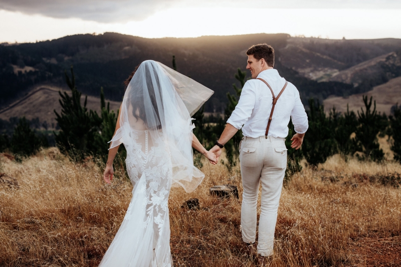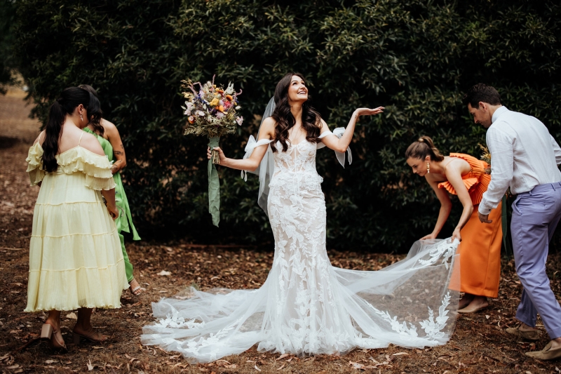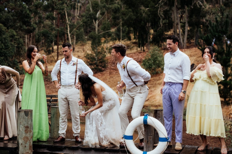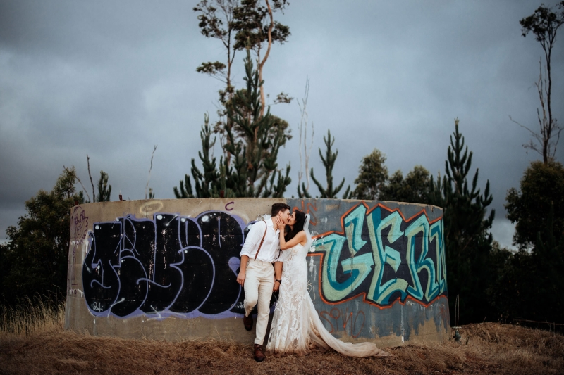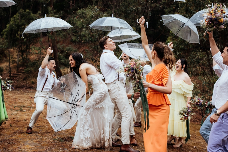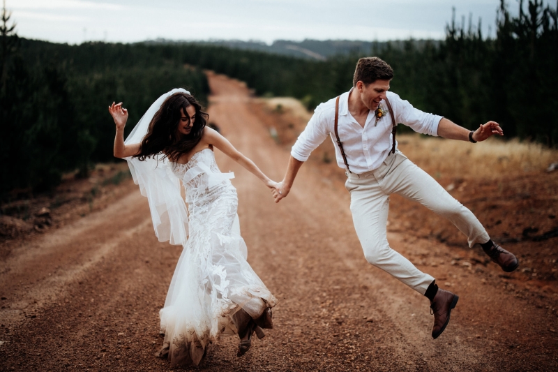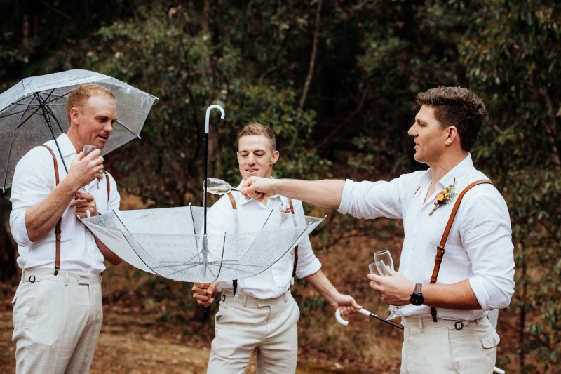 “She had us running through the bushes, climbing up rocks and she was amazing at just letting the moment happen organically. I loved how it captured the beauty among the messy. Josh had ripped his pants, my dress was soaked in the wet red dirt, my frizzy hair, my bustle had broken, the train was dragging on the floor through the bushes, and we laughed so much the whole time. We even invented the umbrellery, which is the umbrella version of a shoey, which Victoria ran to capture the moment as the boys drank champagne out of the umbrella!”