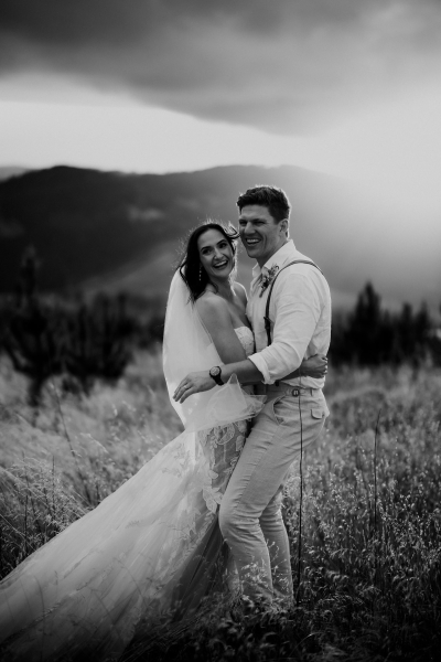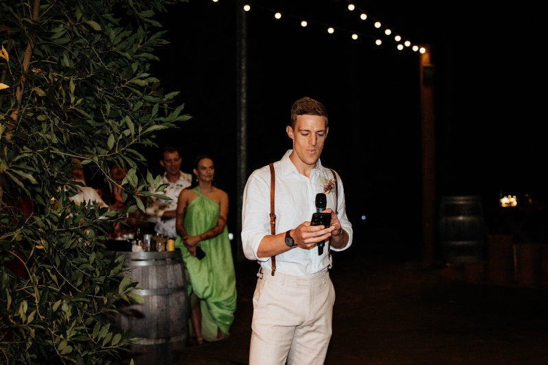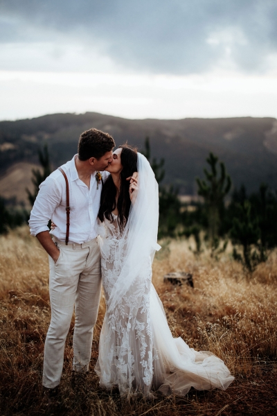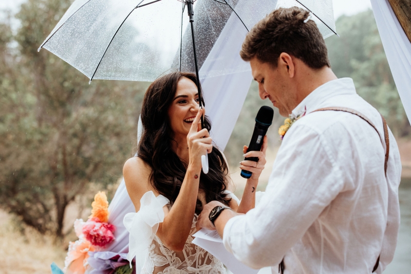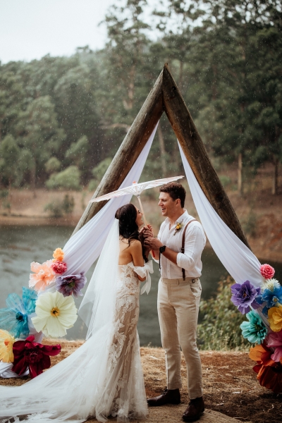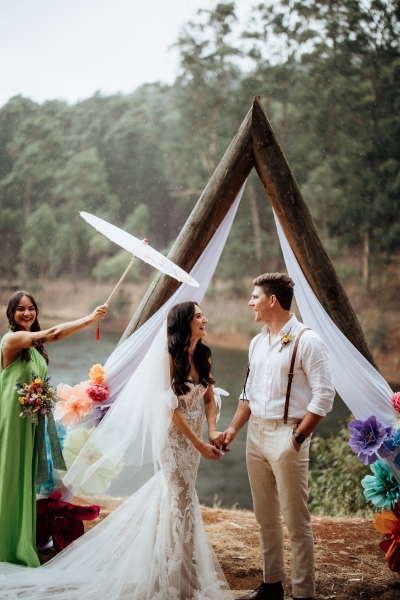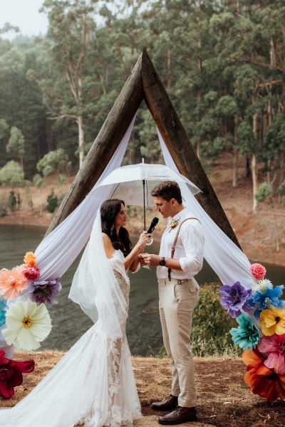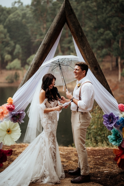 The ceremony took place on a hill above the dam, and the rain made for the perfect backdrop. And with the help of their celebrant, Weddings by Bianca, their fun ceremony was exactly as they had dreamed. “Josh and I wanted to keep it playful and wanted to take a moment to look out at all our friends and take in how special it is that you’re all sharing this moment together. Seeing them wave or smile was very special. We also had a ring-warming ceremony for the grandparents and parents in the background, so they could say a prayer or offer well wishes while holding the rings. Josh and I laughed a lot throughout; it was the best.”