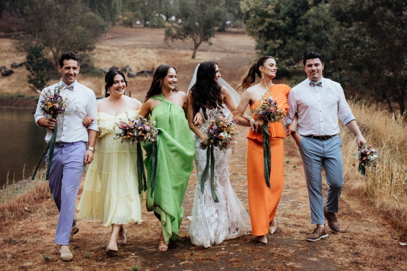 Within her own wedding party, Laura had everyone in different colours, from beautiful buttercup yellow to zesty orange, vibrant green and delicate purple.
