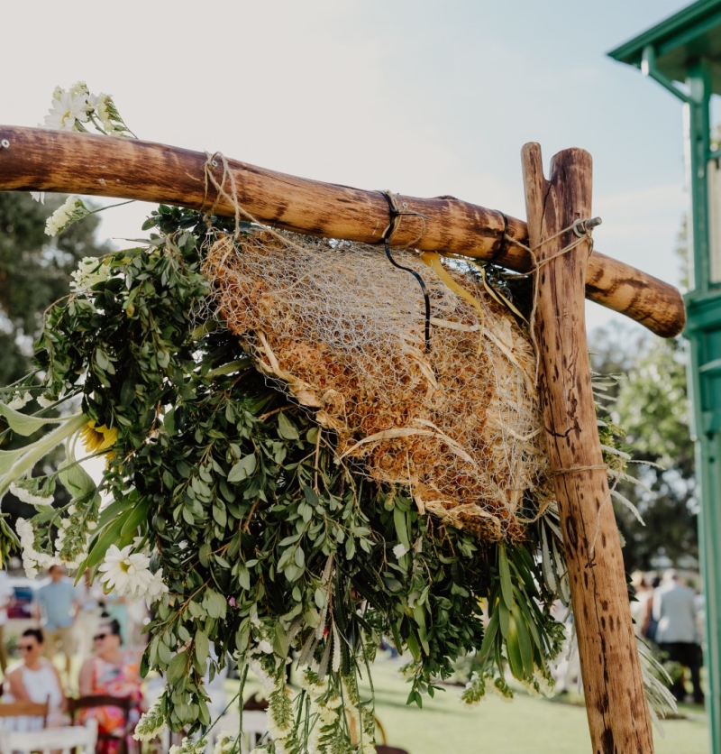 An arbour floral piece from the back – The Freo Florist held her Sideau together with chicken wire to get the desired shape