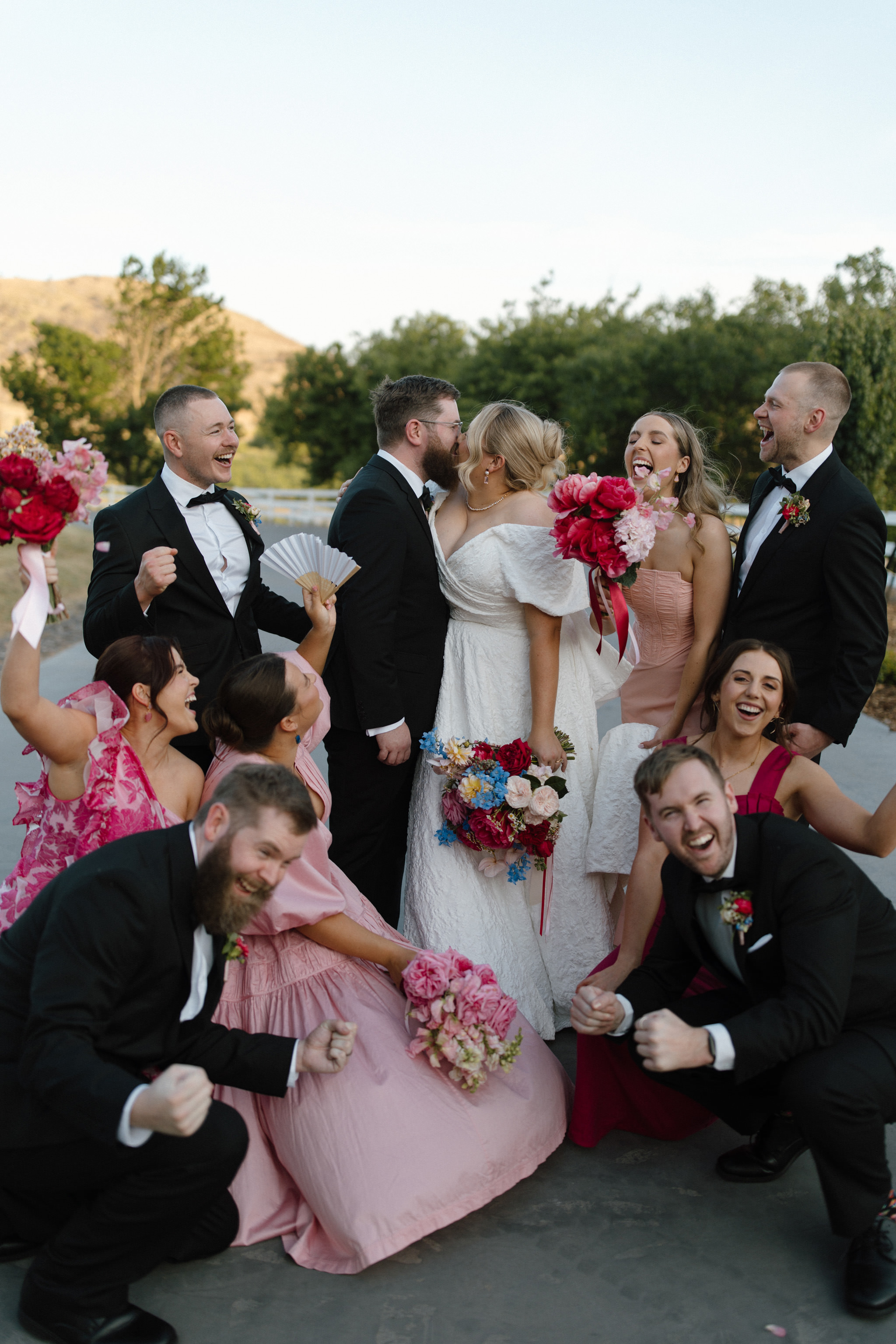 Image three description: A close-up shot of the bridesmaids in baby pink dresses standing around the bride, all holding their deep red bouquets.]⁠
