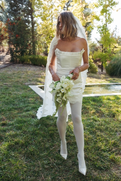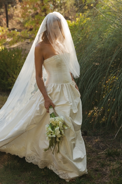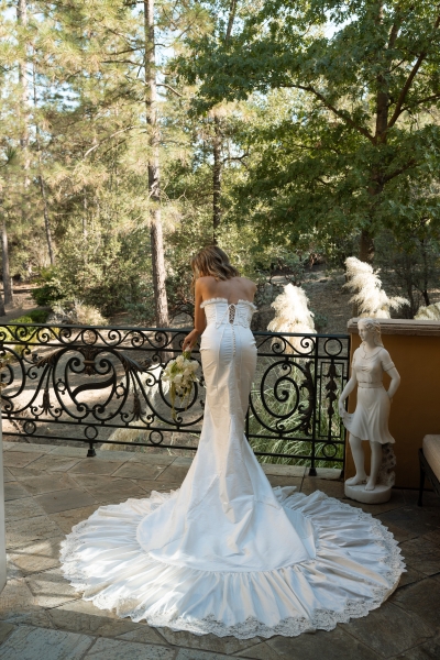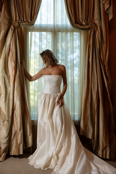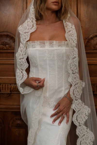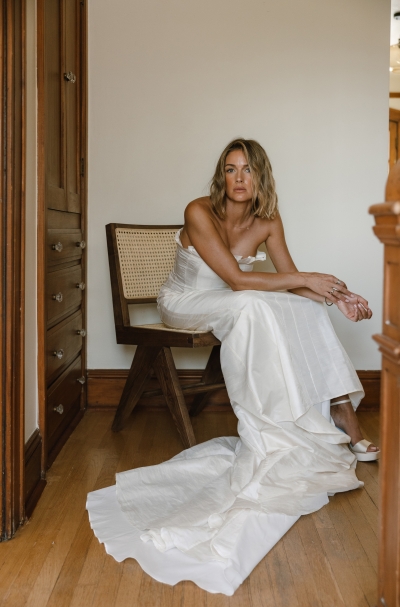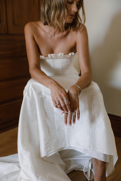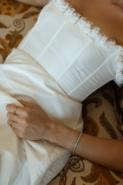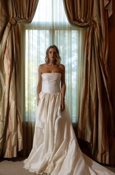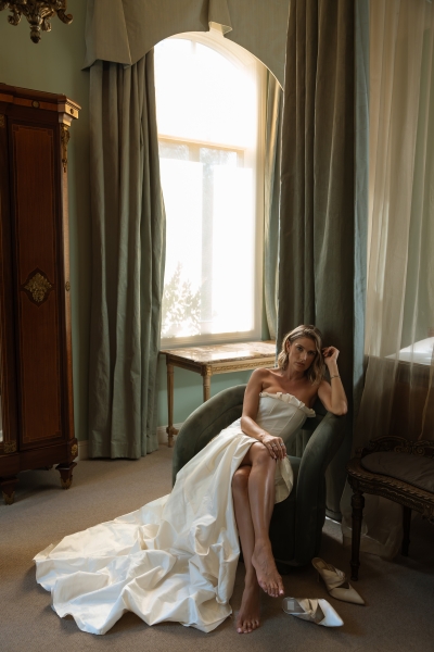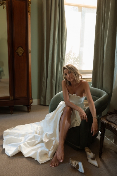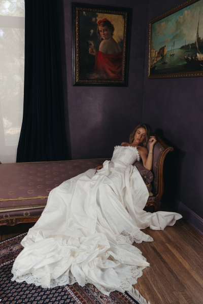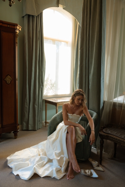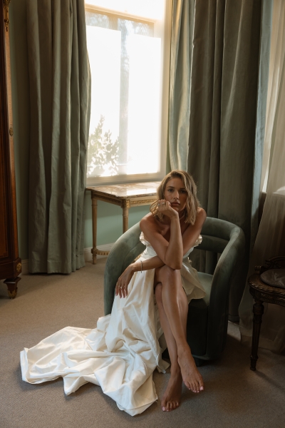The “Moon River” collection is no different. Speaking to romance dipped in messy hair, sun-kissed skin, tightly wrapped arms and daydreams you never want to leave. Made from 100% silk with French corded lace trims, 70-inspired ruffles and Victorian-era box pleats. Captured by Dakota Lynn Photo and Melody Olivas, the fall/winter 2026 collection is born from a love generations built. With beautiful flowers from FleurElise Floral Studio and the stunning backdrop of Château du Sureau, each detail speaks to a timeless romance we adore.
