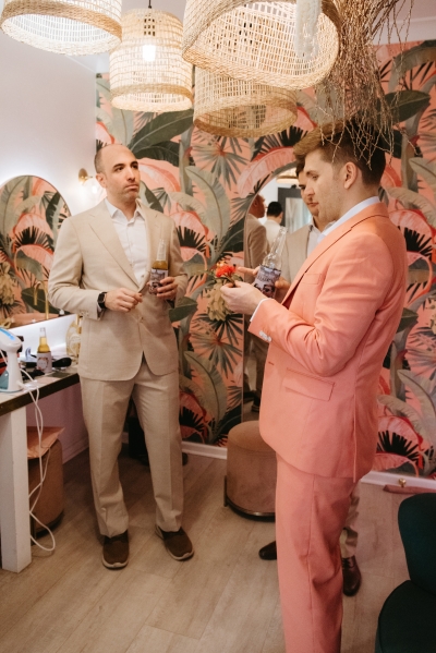 Image two description: Two groomsmen stand along a garden path, each holding a bouquet of pastel flowers playfully up to their faces. Dressed in white shirts and dark trousers.⁠
