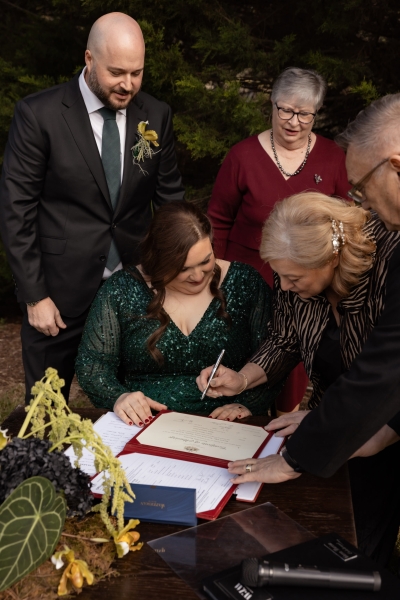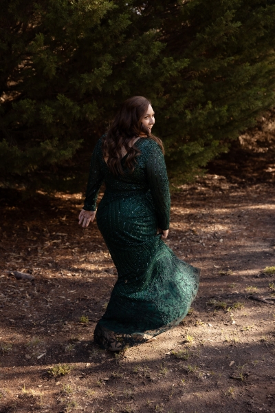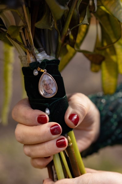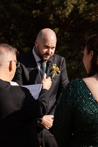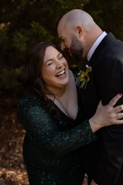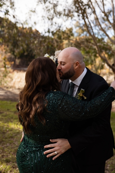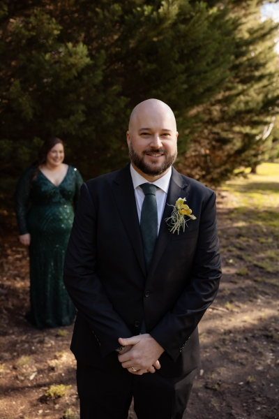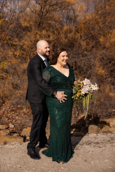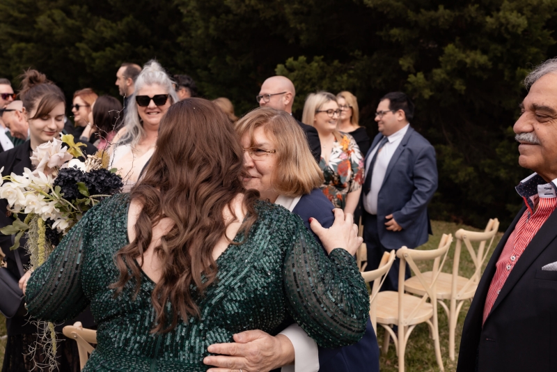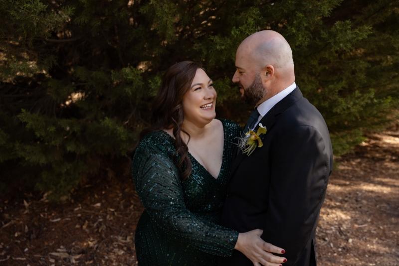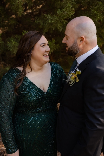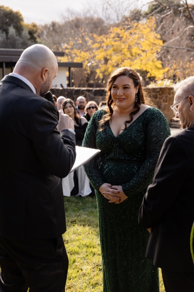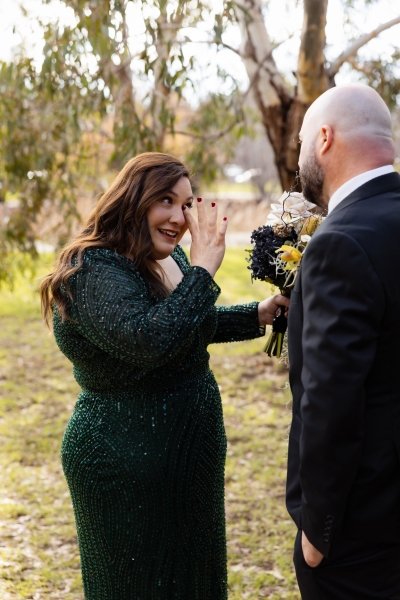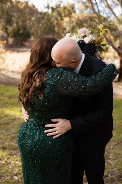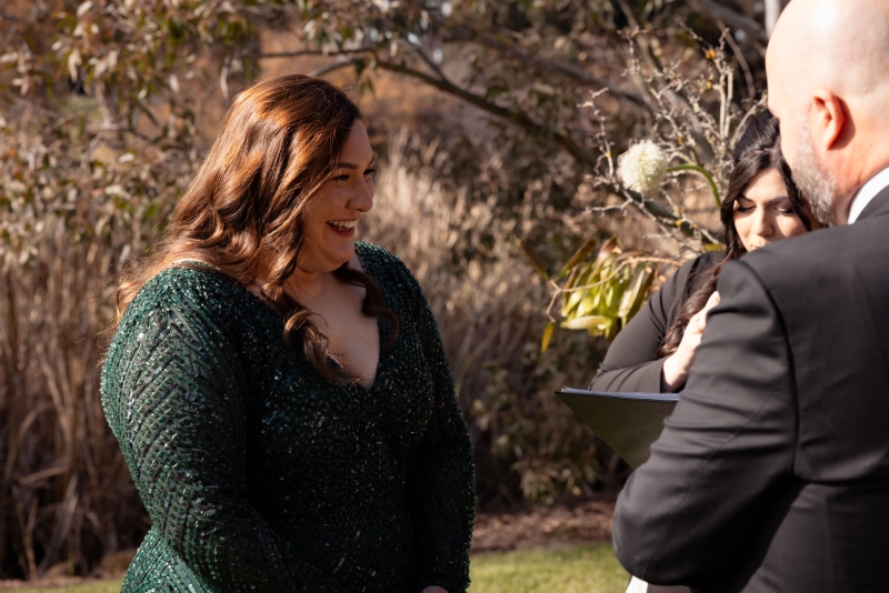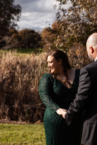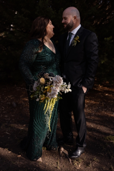 “I had found an emerald green dress online and I couldn’t get it out of my head. It had all the sparkles! The colour was beautiful, and when I went into the store to try it on, I felt amazing in it. I felt like myself but in the best way. It also coincidentally married in very nicely with the style of our wedding so I couldn’t not get married in it.”