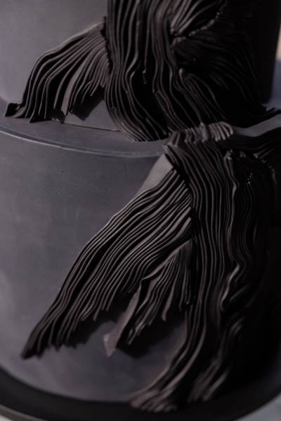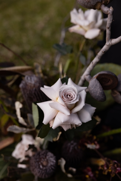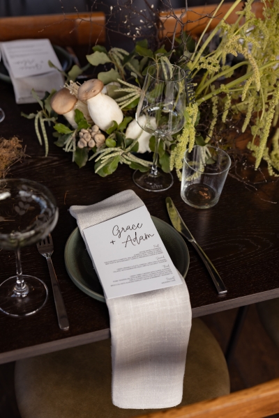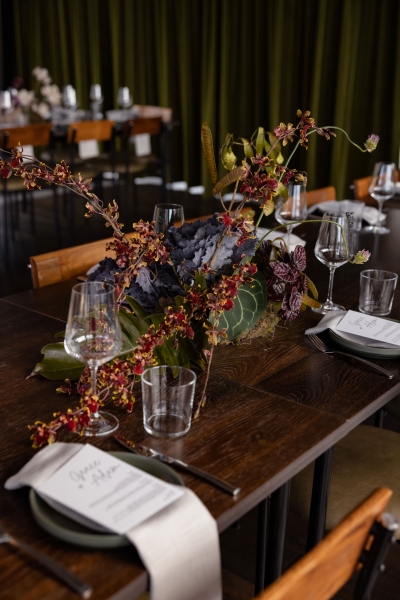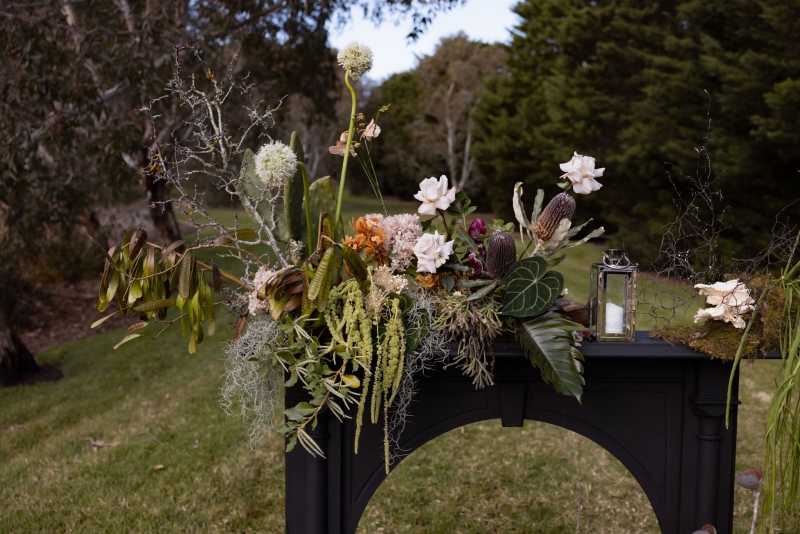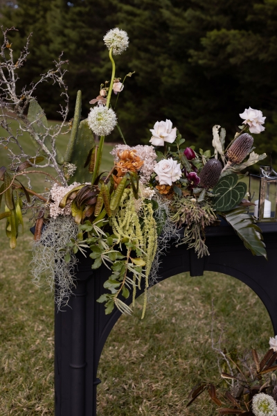As mentioned earlier, Grace is an events florist and wanted to infuse her love of all things botanical into her and Adam’s moody wedding. “My personal floral style is very quirky and I find beauty in unusual botanical materials. I provided a mood board and colour scheme to my incredibly talented boss at Peony & Weasel Flower Co. and trusted her completely with my vision. The colour palette was black, green, mushroom, parchment and moss. The overall style wasn’t based so much on flowers but more on textures. The use of moss, rhipsalis plants, pods, sea sponges, mushrooms, twigs and sticks brought together with touches of slipper orchids and other bold flowers to contrast, created lots of quirky details.”