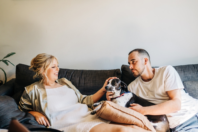 “1. Getting ready together in our home before the wedding with our best friends (and our dog!).