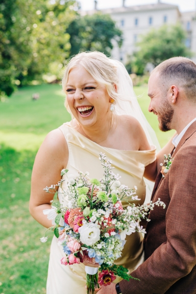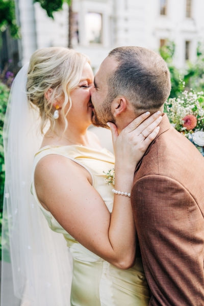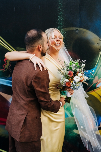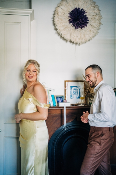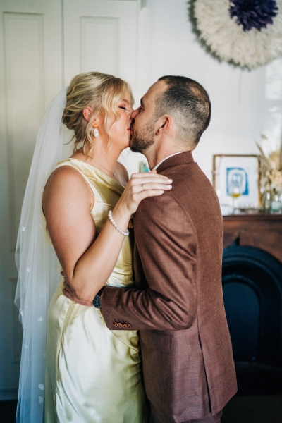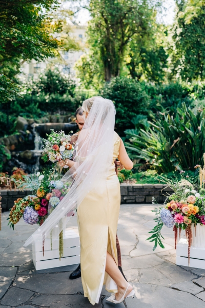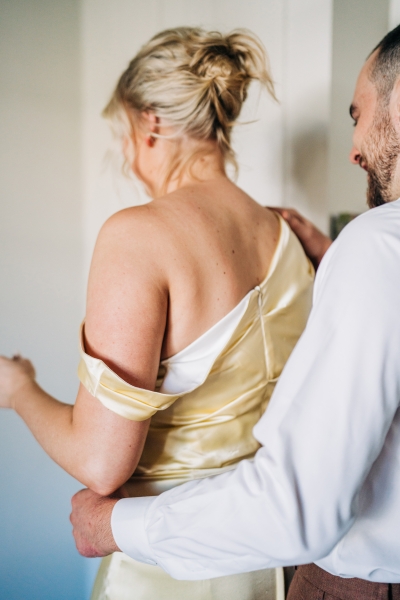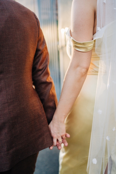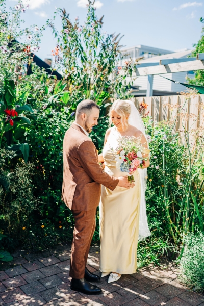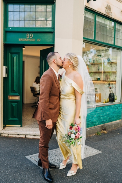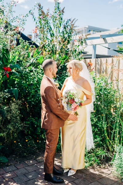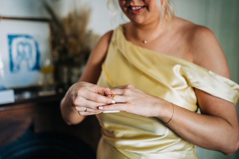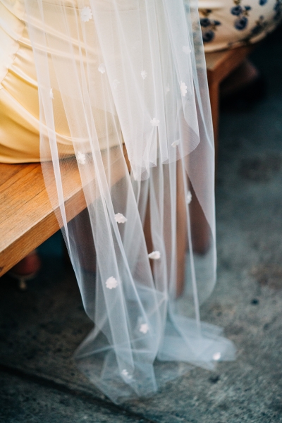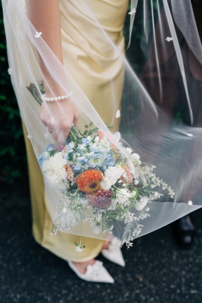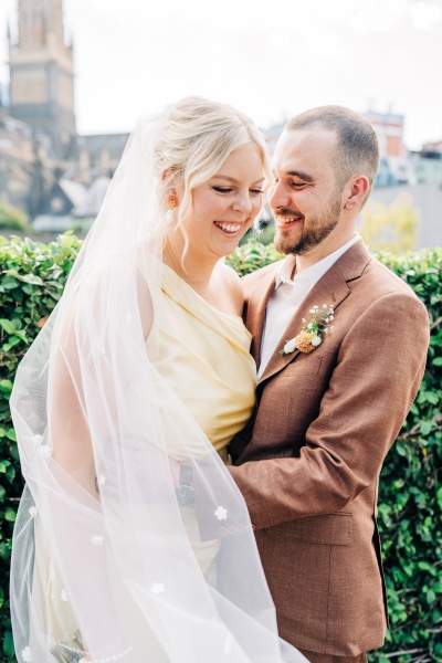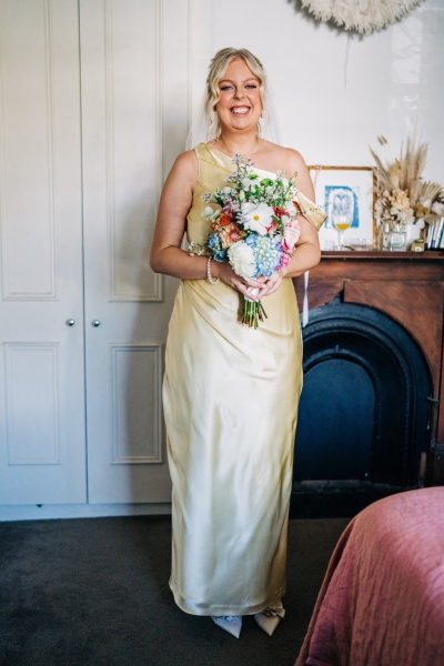 Working with Honeymoon Studios, Sophie brought her dream dress to life. “I was drawn to them because they make such beautiful, fun and contemporary wedding attire, that comes without the fuss or ginormous price tag. The founder, Andria, had a new design at the time that I loved, but there wasn’t a sample to try on. I decided to take the plunge regardless and I was so happy with how it turned out. We decided on buttery yellow silk satin as well, which made it even more special for me, as my engagement ring is a yellow stone and it’s my favourite colour. I also got a veil from Honeymoon Studios which had little silk flowers embroidered on it, which felt like a perfect touch as Daniel is a gardener,” she shared.
