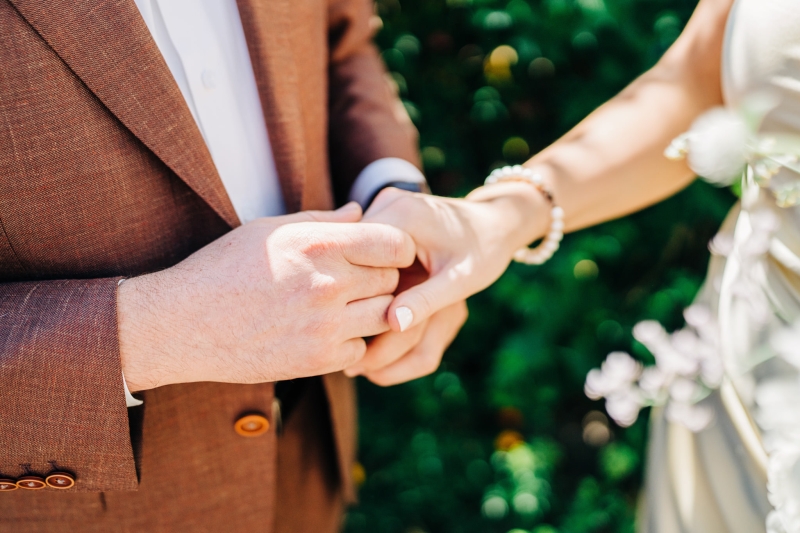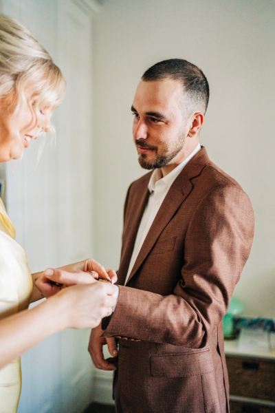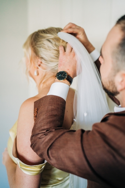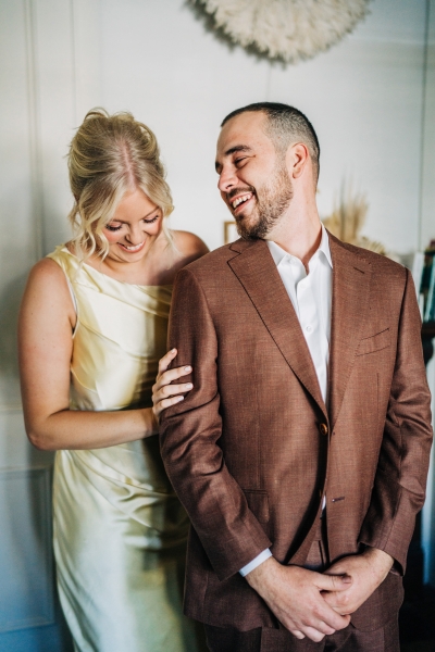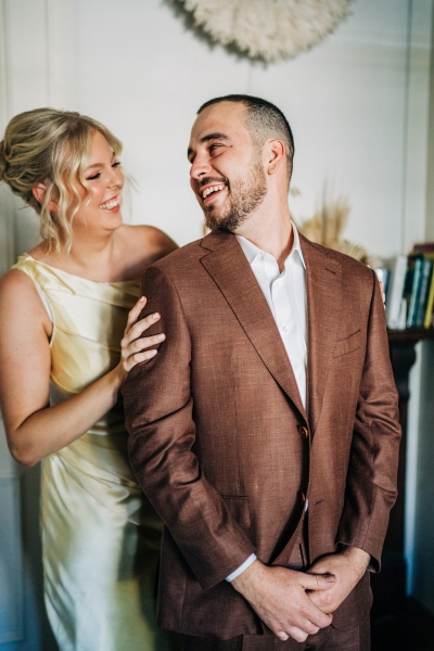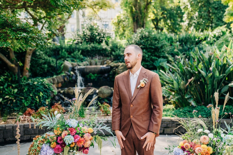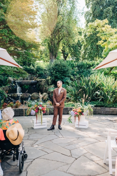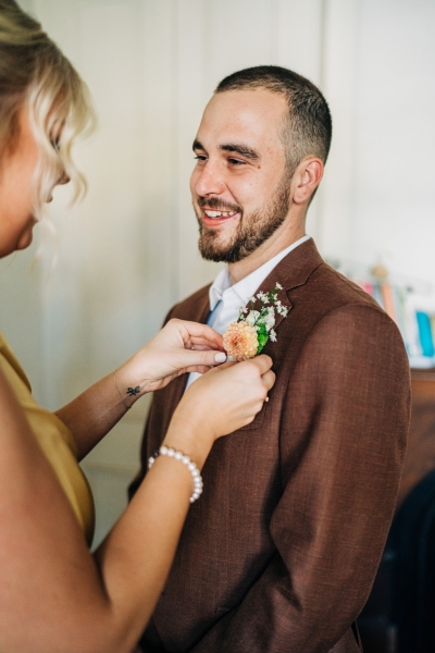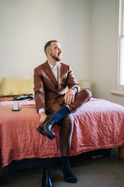 Daniel chose a lightweight, warm brown two-piece suit custom-made at The Fabric Lab. “He paired it with a white shirt, dark brown leather shoes and a belt, but he opted for no tie. He wanted something ‘warm’ in colour, a little bit different to the traditional wedding suit, that would complement my warm-coloured dress and also be wearable again after the wedding. It looked gorgeous on the day and in the photos, and overall felt much more down-to-earth and him.”