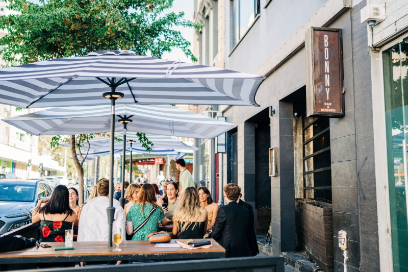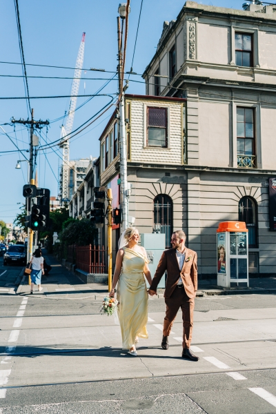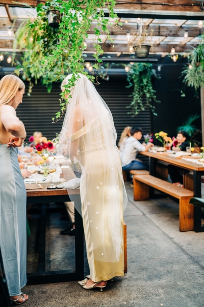 Their reception was at Bonny Bar in Fitzroy, just up the road from the gardens. “We wanted a relaxed, canapé-style dinner with no set seating plan, where we could have delicious food, wine, and a space to dance later in the night. We were also able to spill out onto the street in the afternoon whilst the weather was warm, but then head inside to party into the night.”